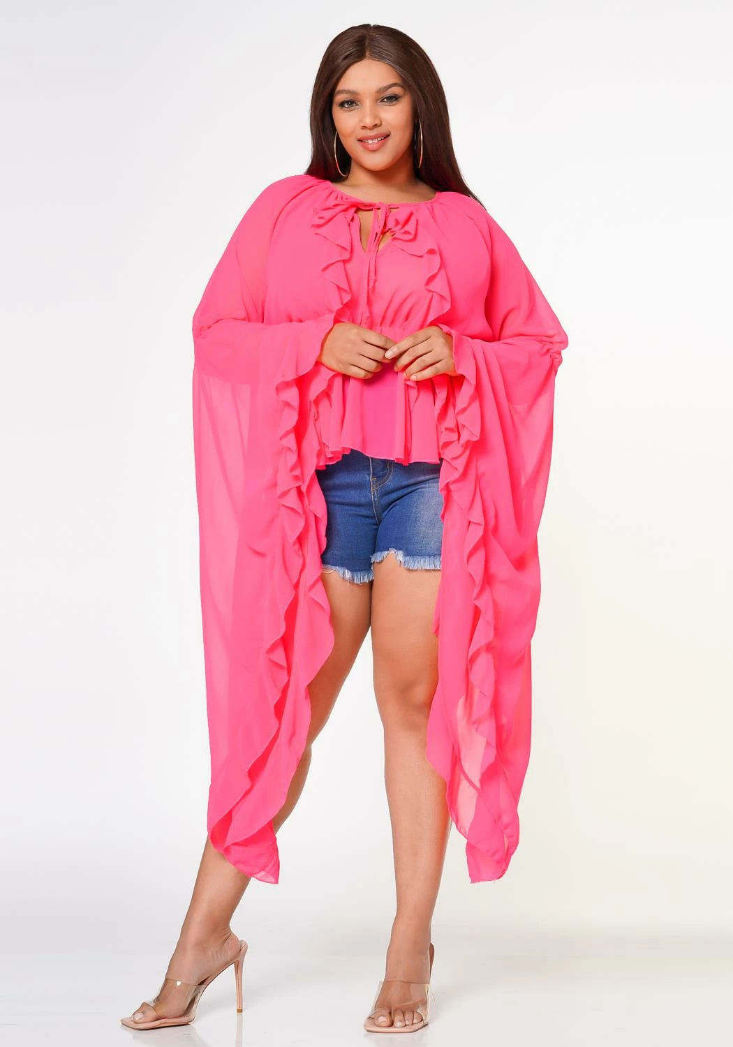 Flattering plus size women’s blouse which features wide flare long sleeves, ruffle details, flare peplum and tie front ascent.