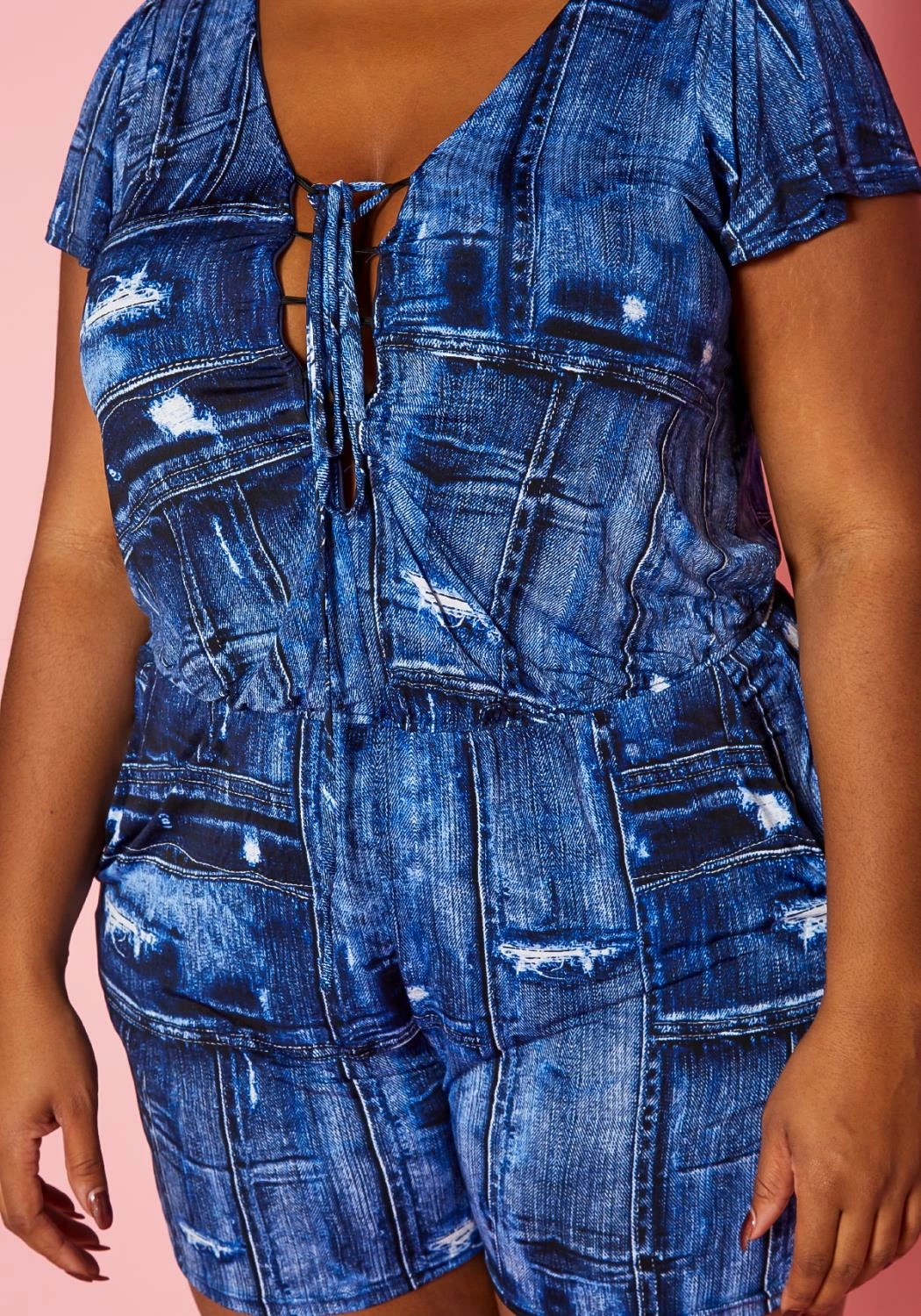 Plus size women’s romper in faux denim print, short sleeve, side pockets, elastic waistline hem and front tie up ascent.