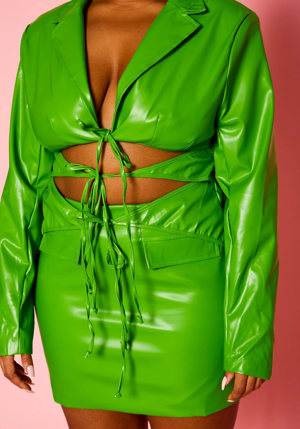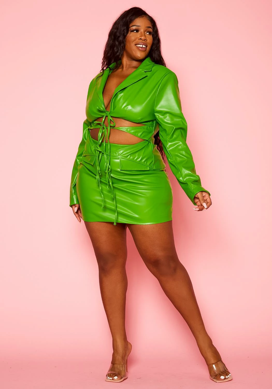 Stunning plus size women’s faux leather dress with front cut-out design, collar neck style, tie front details and faux pocket hem.