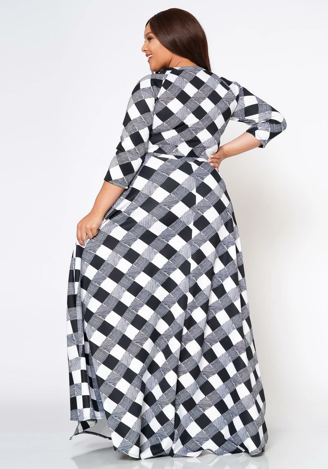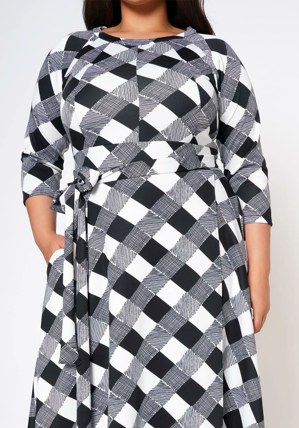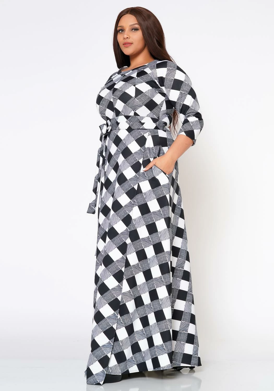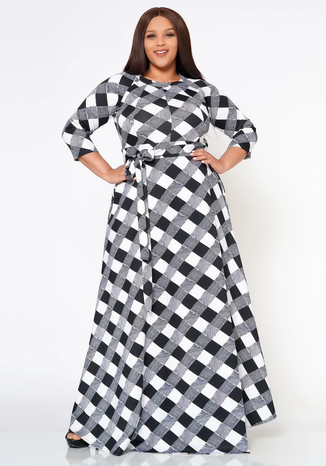 One of a kind plus size women’s fit & flare maxi dress in plaid print, 3/4 fitted long sleeves, pocket ascent, round neck and waist tie ascent.
