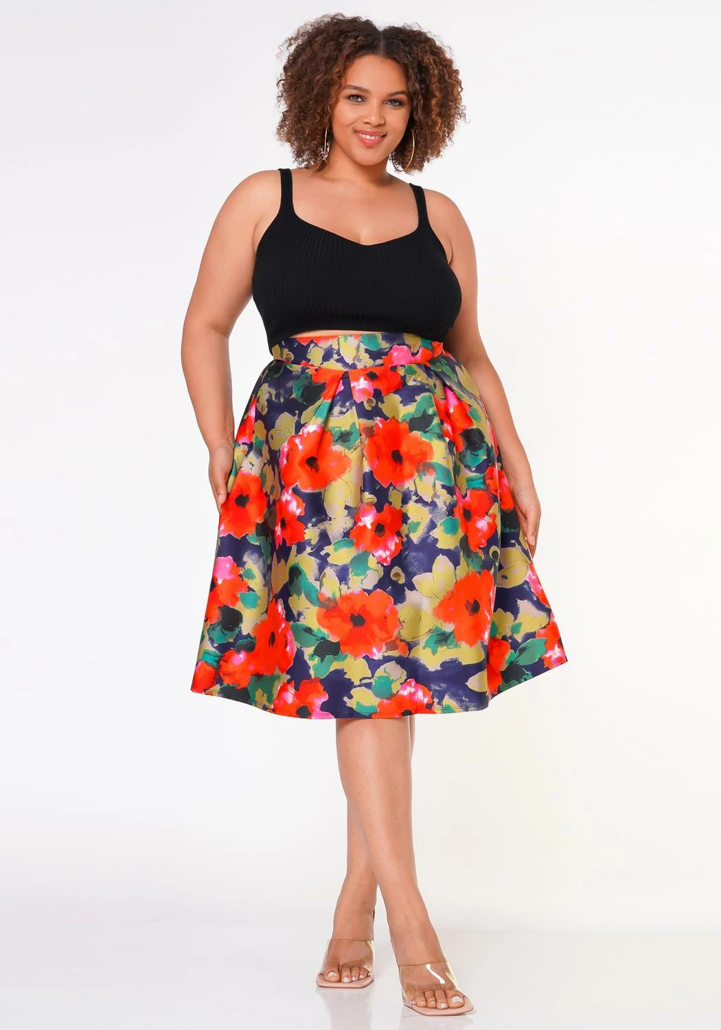 Lovely plus size women’s floral pattern midi skirt in wide flare hem, high waist style and zipper closure.