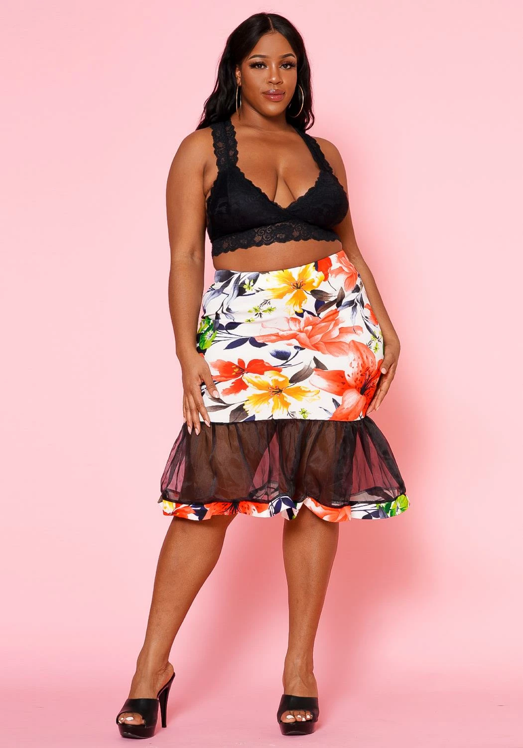 Gorgeous plus size women’s mini skirt with flare mesh hem design, high waist style and floral patten.