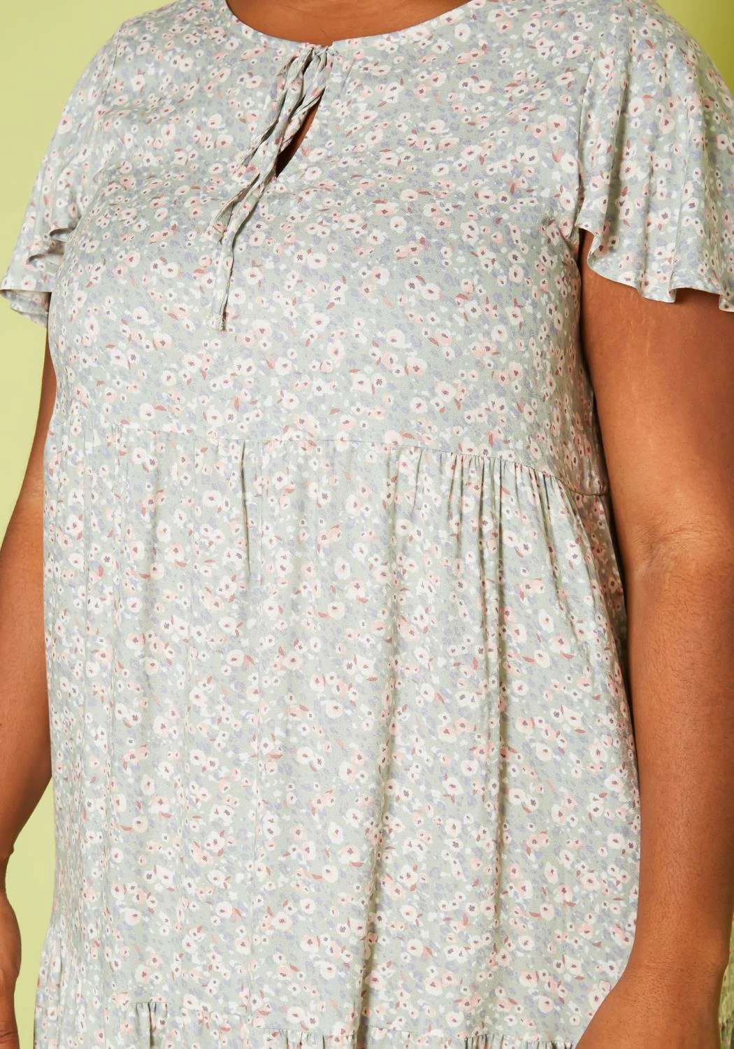 Lovely plus size women’s flare mini dress with round neck style, short sleeves, tie front detail and ruffle flare end.