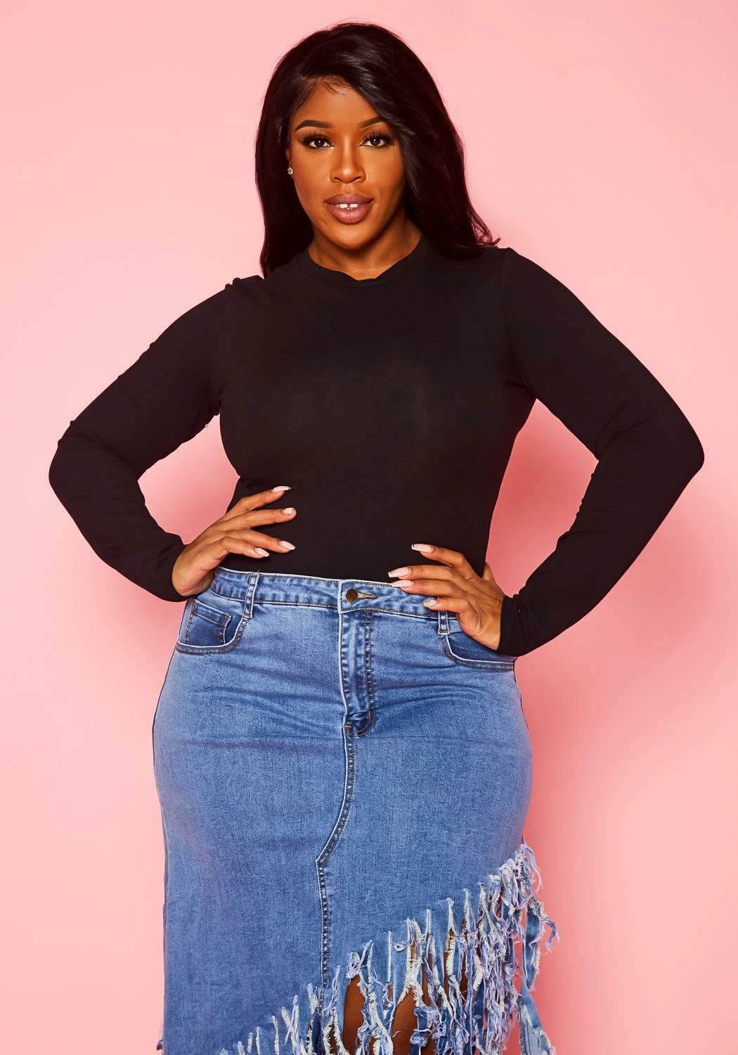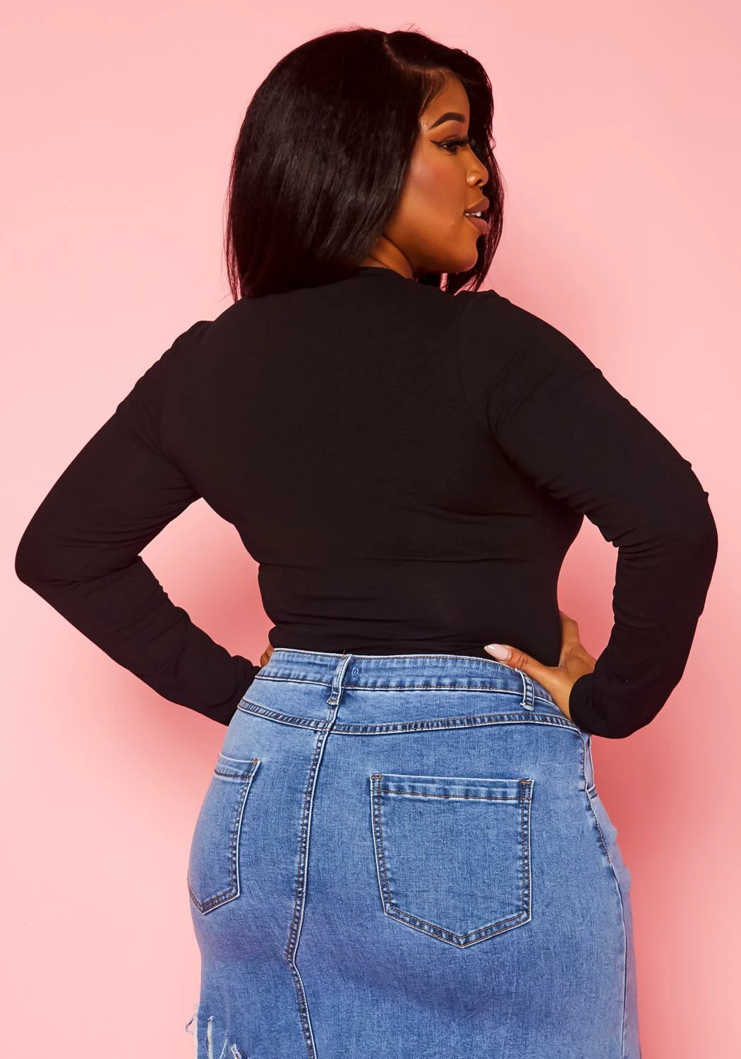 Flattering basic bodysuit for plus size women in crew neckline, long sleeve, butter soft material and snap button closure.
