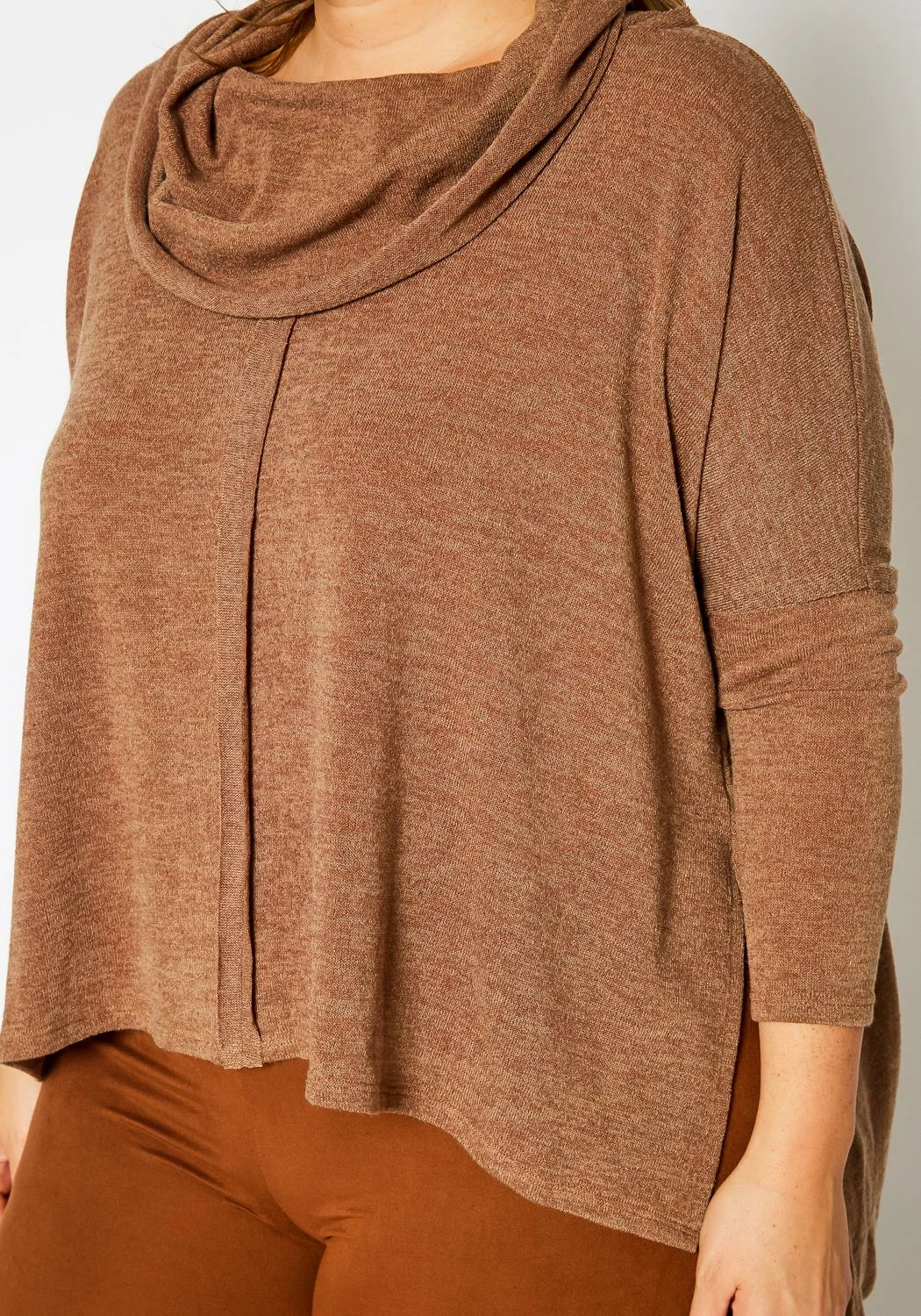 Plus size women’s sweater top in knit material, funnel neck style, fitted long sleeves and relaxed hem.