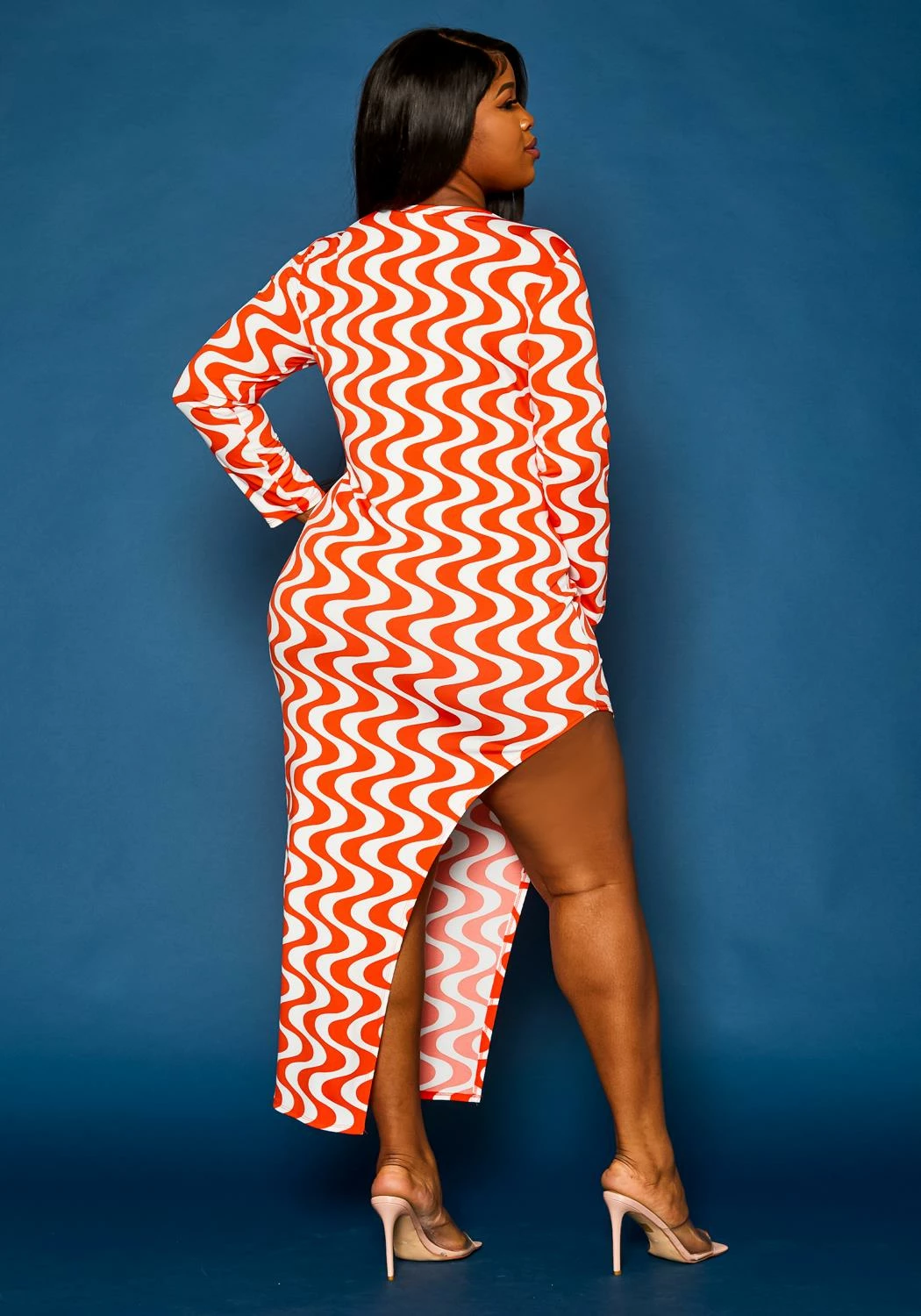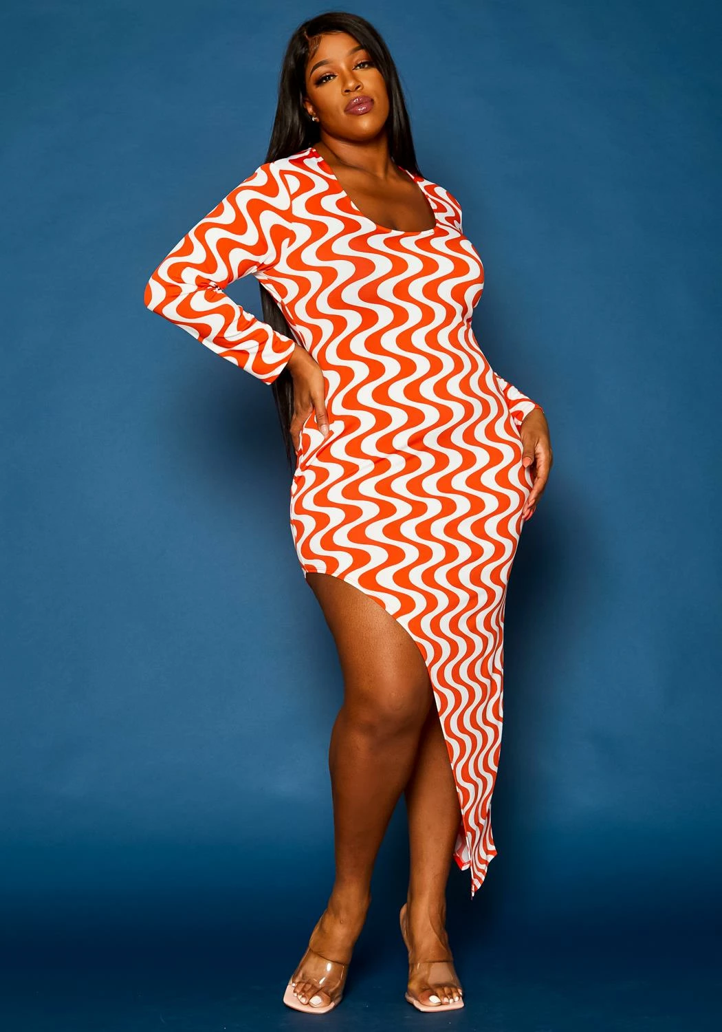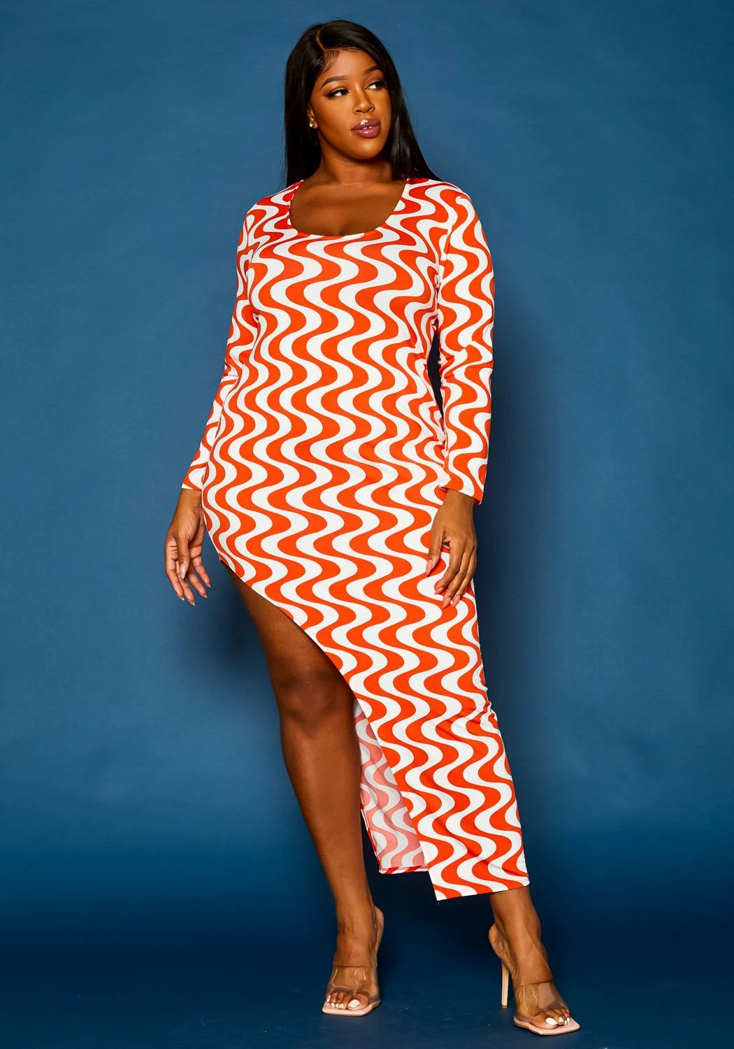 Gorgeous plus size women’s maxi dress in geometric print, square neck style, fitted long sleeve and high low leg slit design.