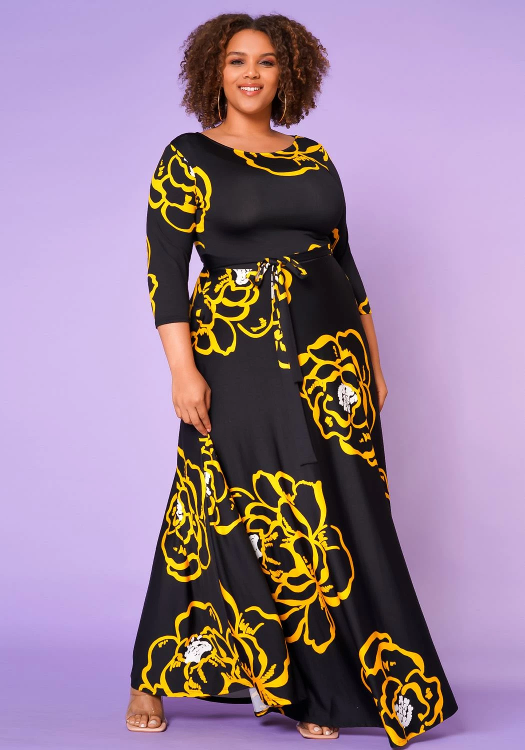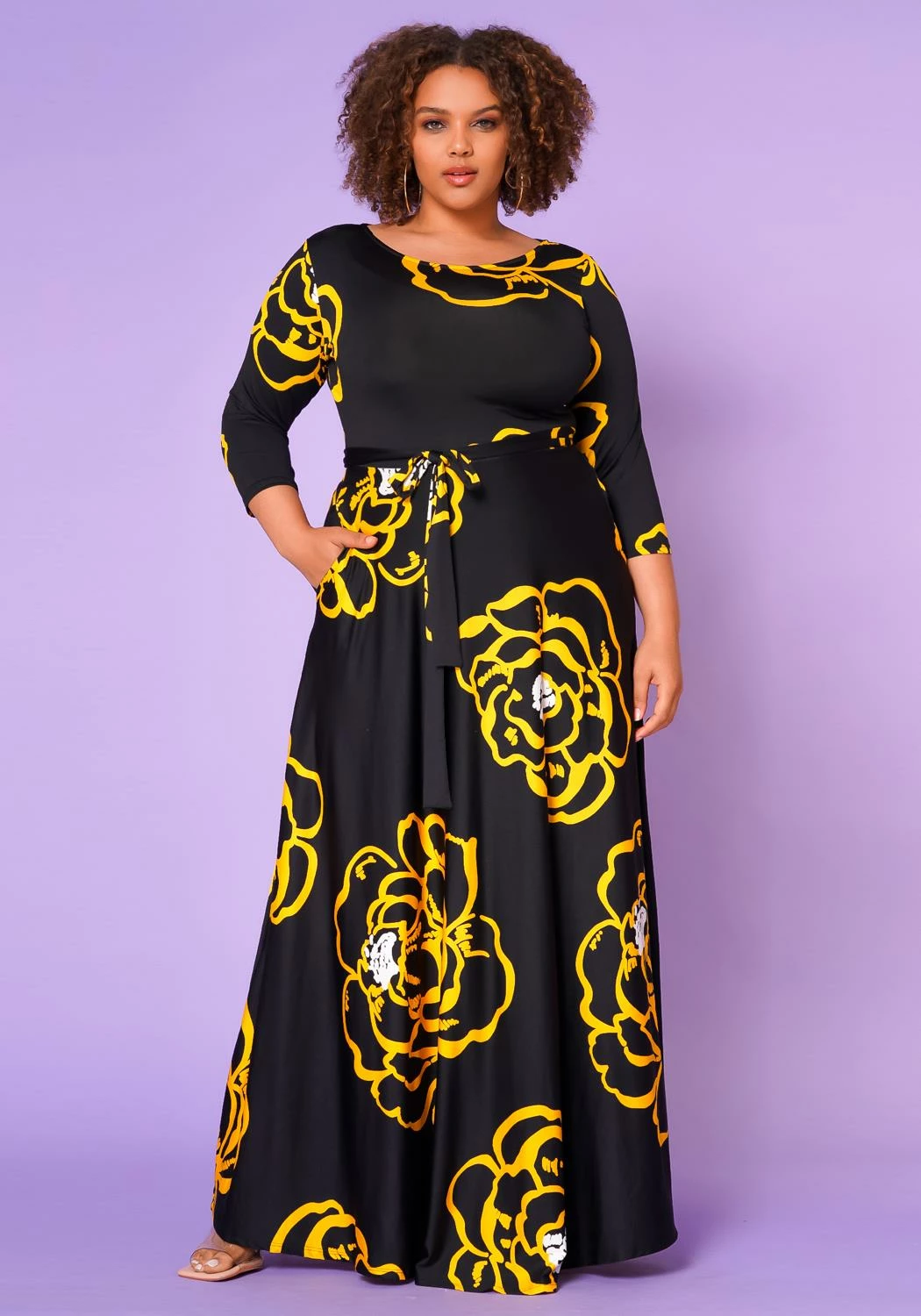 Beautiful plus size women’s bold golden floral print maxi dress in fit to flare style, 3/4 sleeves, round neckline, waist tie ascent and pocket hem.