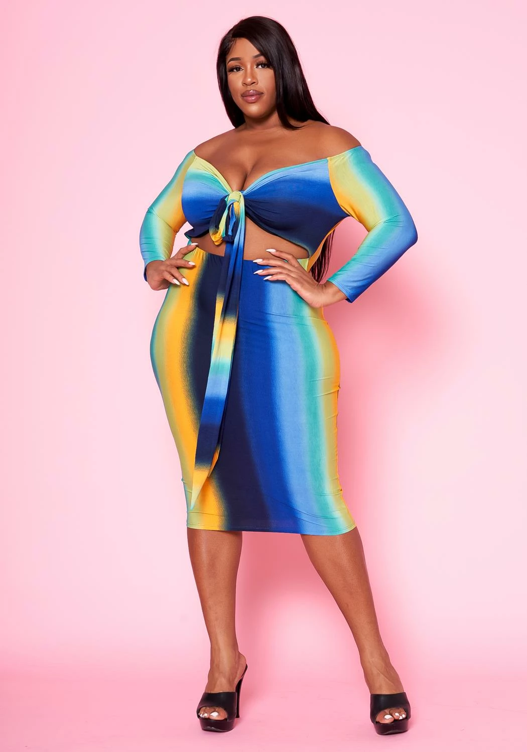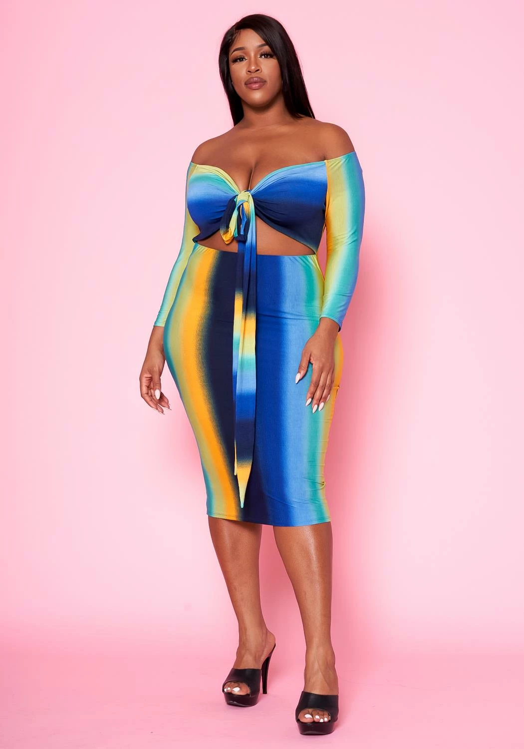 Vacay ready bodycon dress for plus size women in gradient pattern, sweetheart neckline, fitted long sleeves, tie-front and midi length.