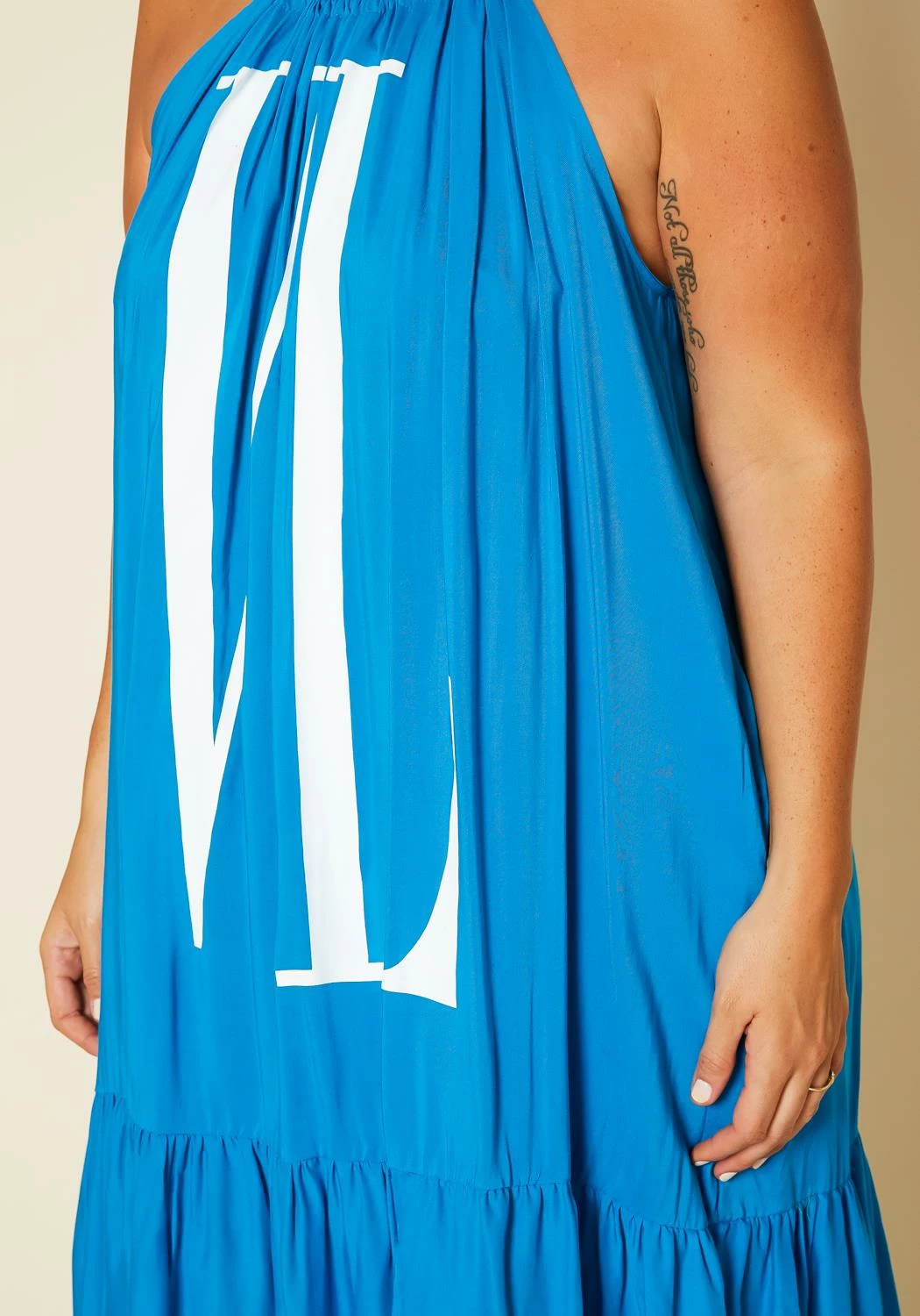 Plus size women’s dress in halter style, featuring a graphic front and back detail ” VL”, tiered hem & drawstring tie up closure.
