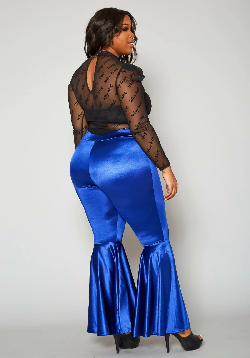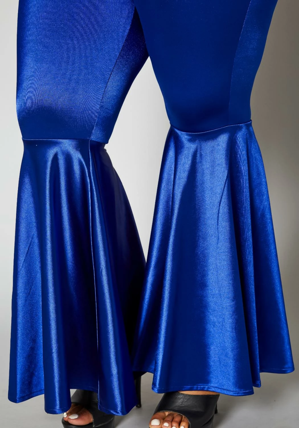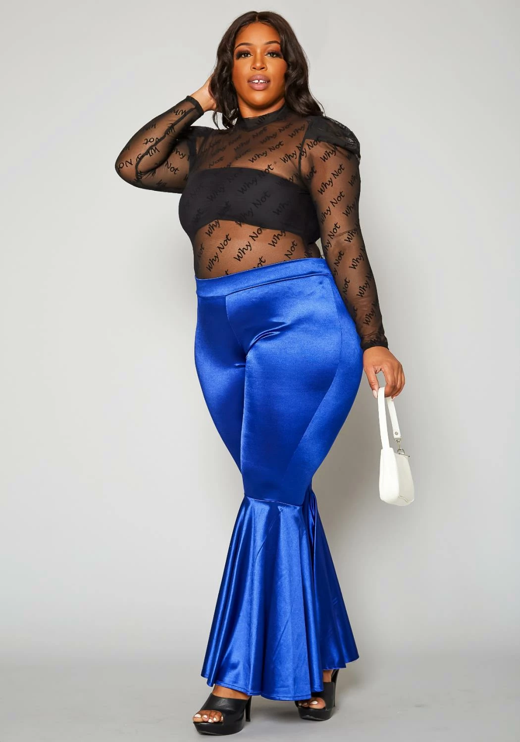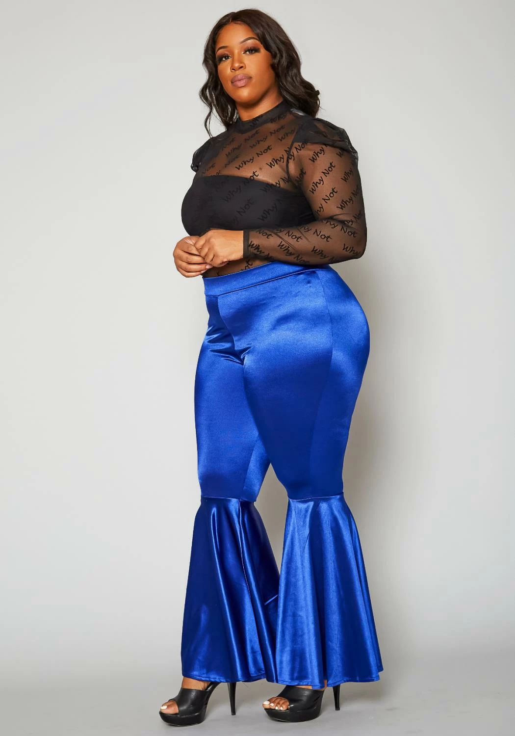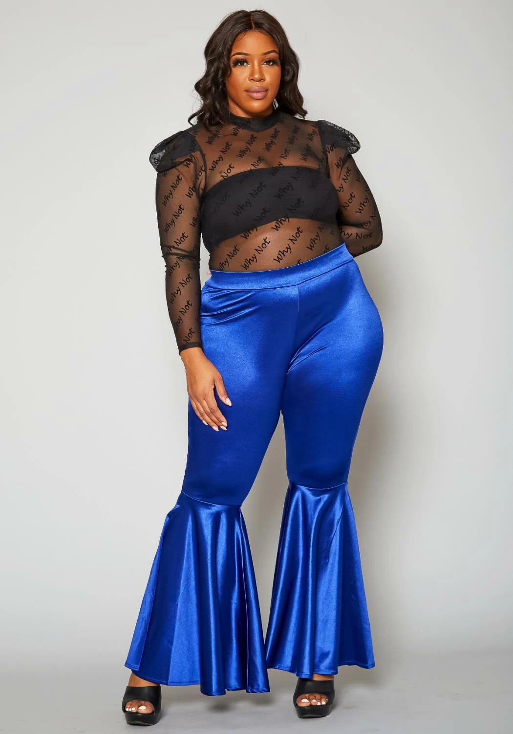 Statement pants for plus size women in high waist style and bell flare leg hem.