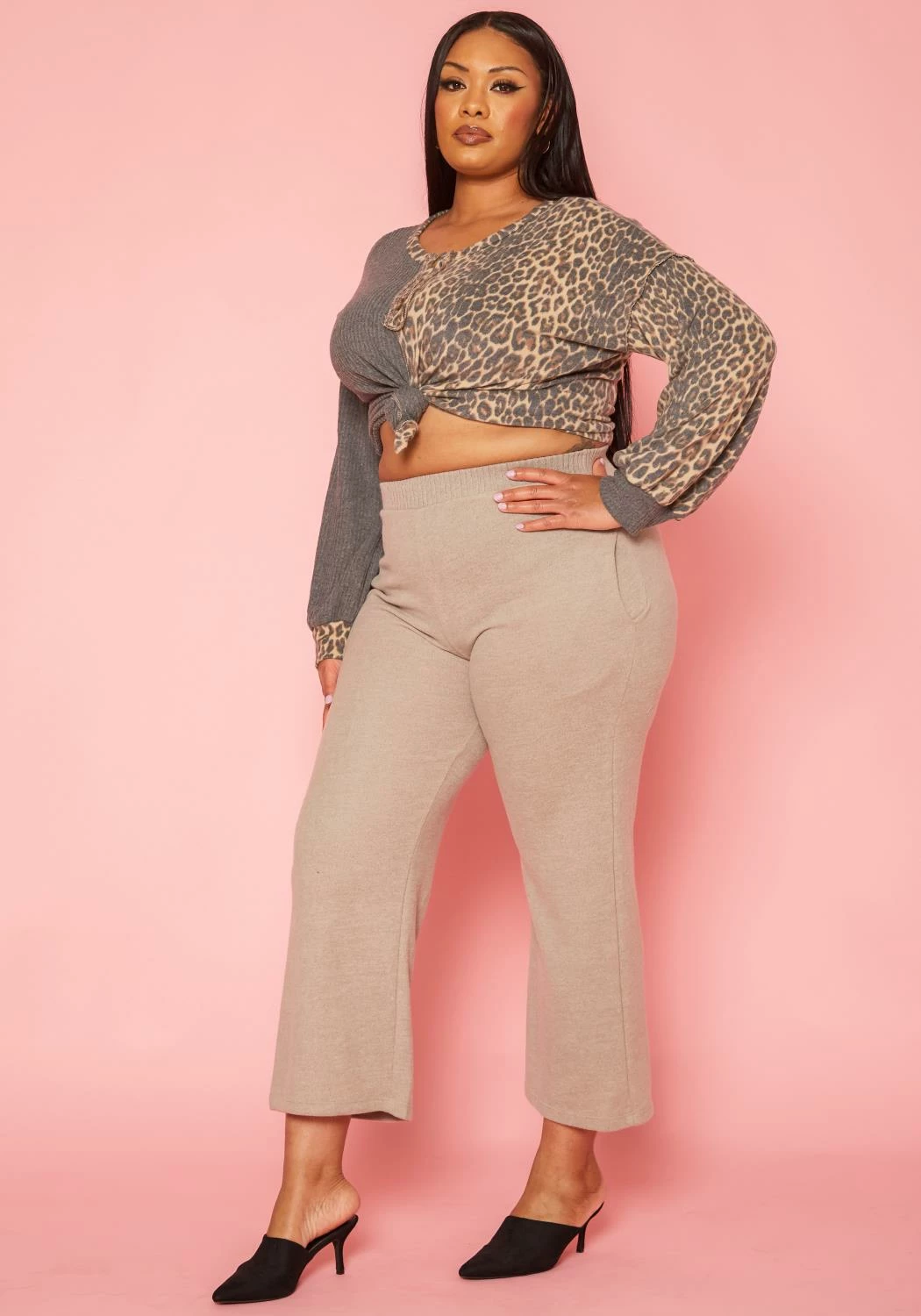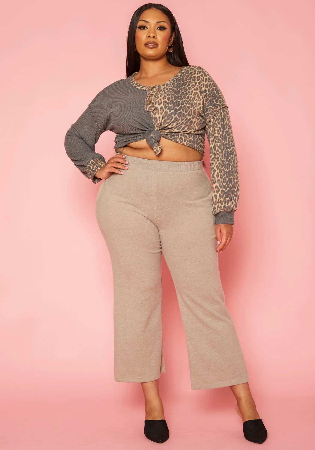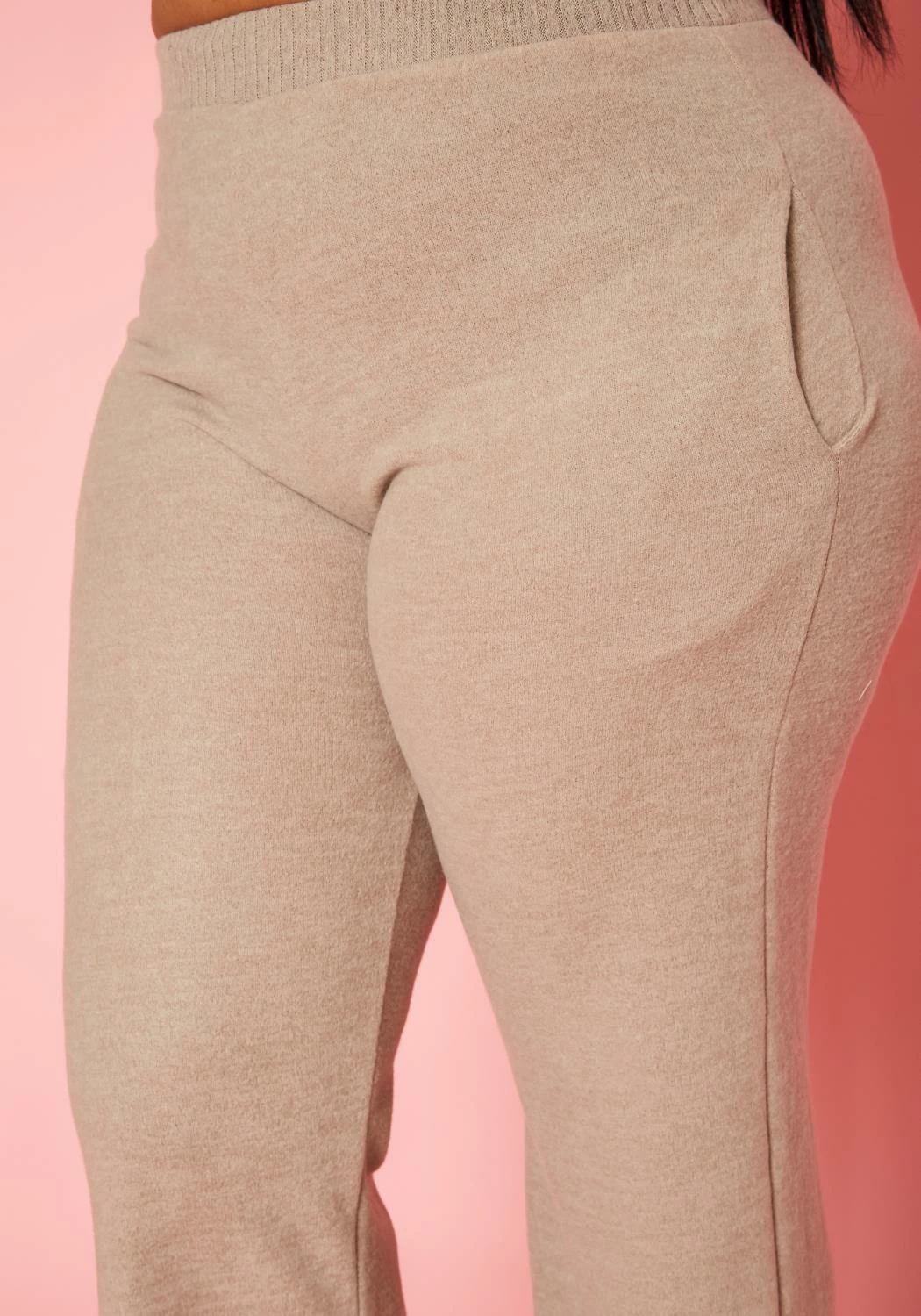 Comfy plus size women’s lounge pants in thick knit material, high waist style and pocket hem.