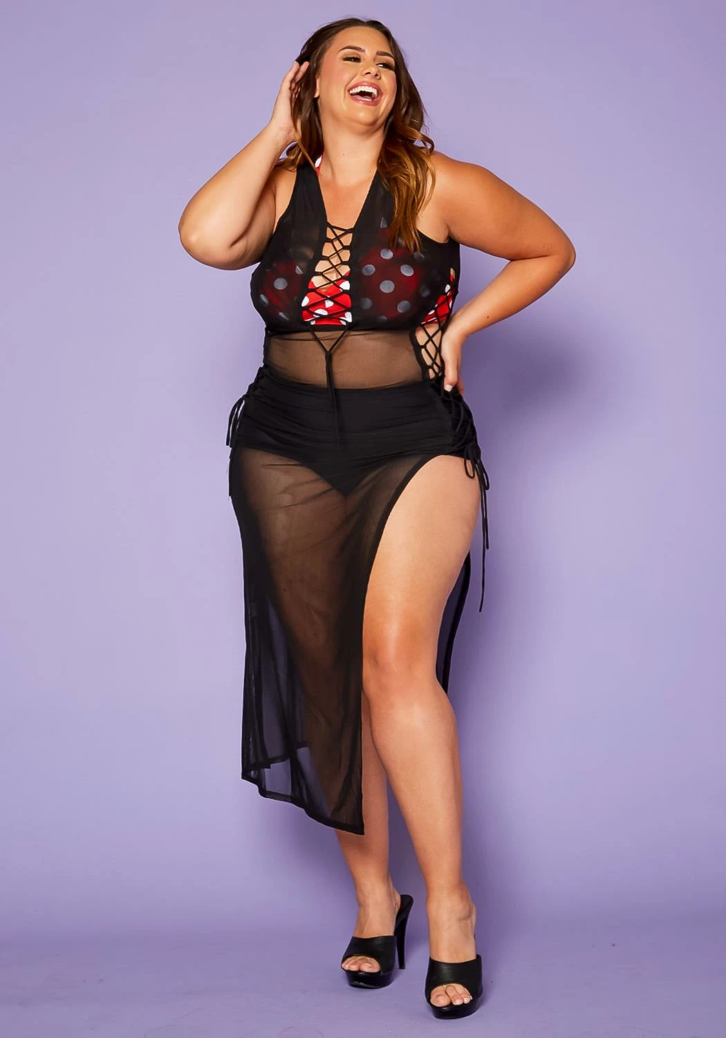Plus size women’s dress in cover up style featuring a front & side tie up detail, mesh style, & side slit ascent.