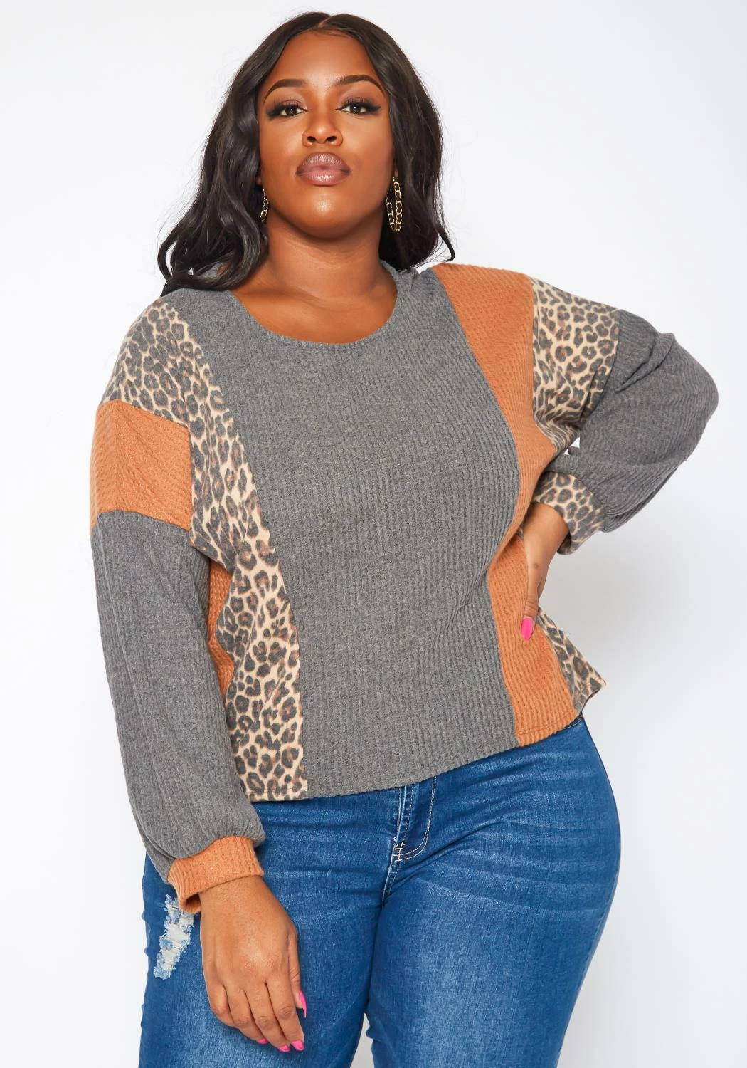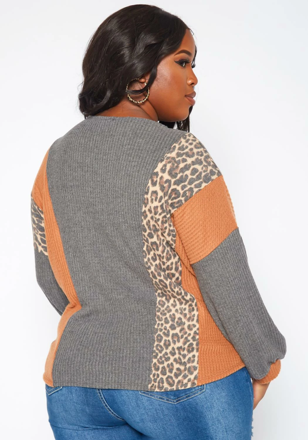Plus size women’s sweater in waffle knit material, color block design, leopard print, fitted wrist cuffs and round neck style.