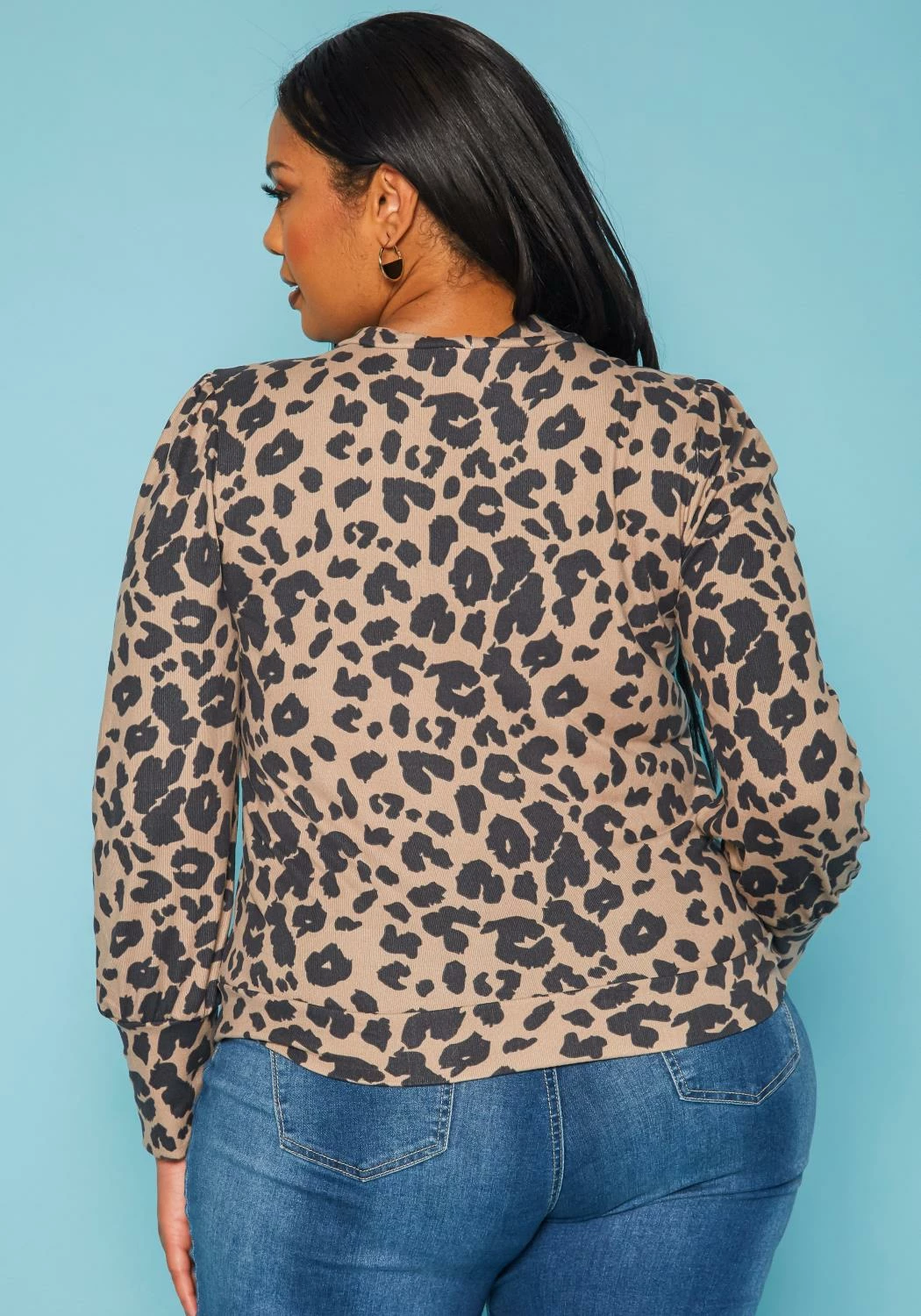 Casual plus size women’s leopard print top in v-neck style, long sleeves and button front closure.