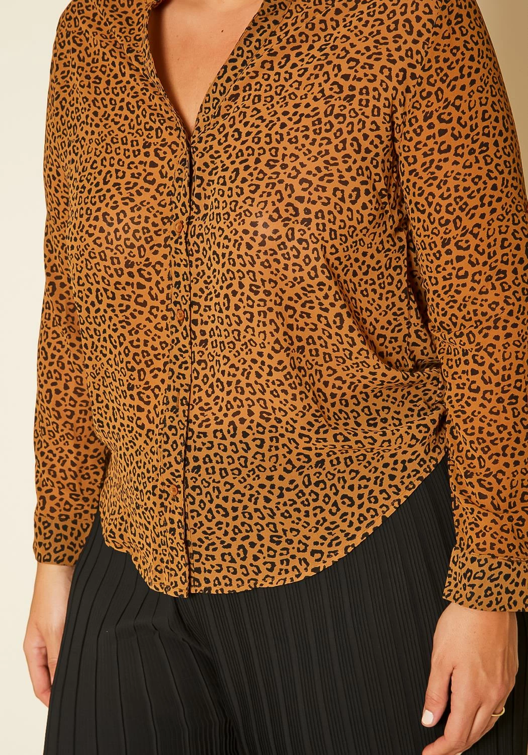 Plus size women’s top in leopard print, featuring v-neck, button up hem, long sleeves with roll hem sleeves.