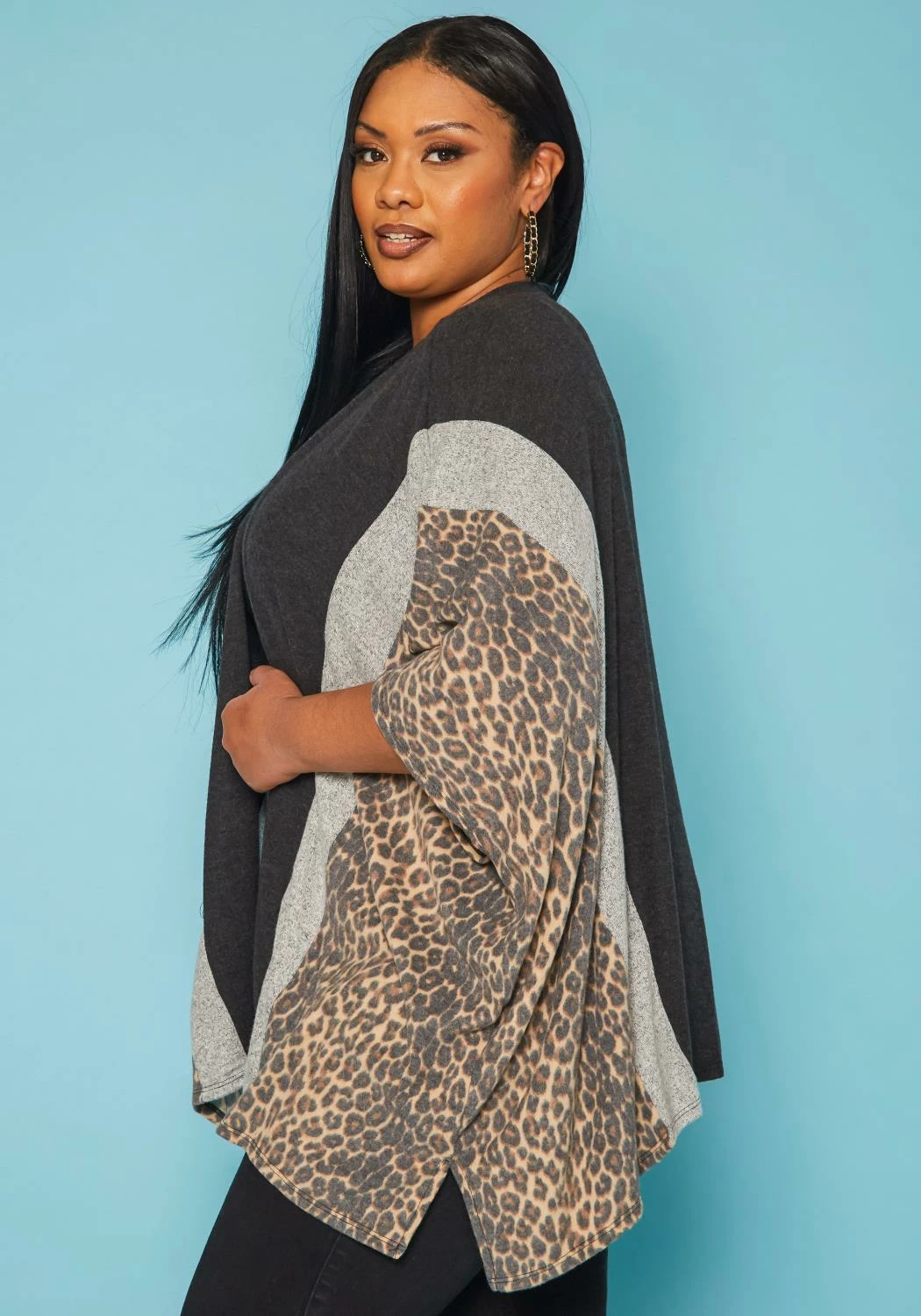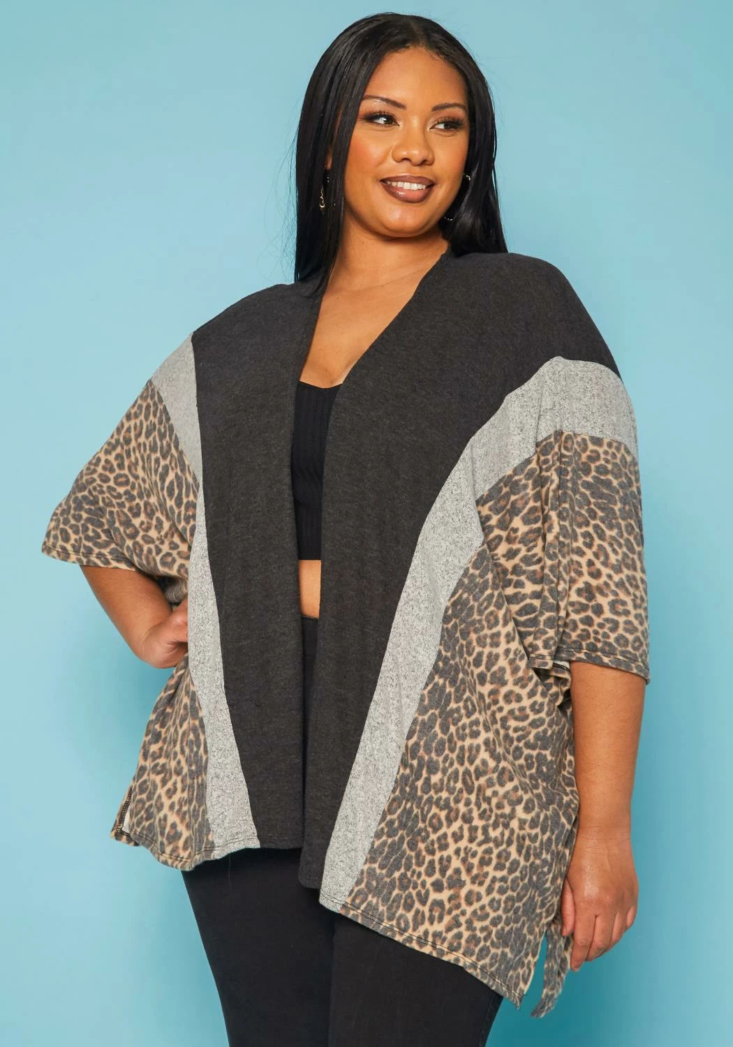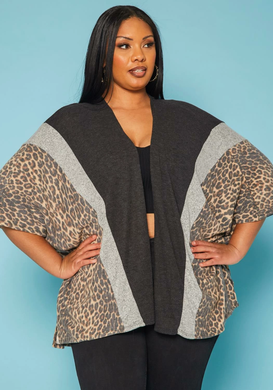 Relaxed fit plus size women’s cardigan in leopard print, color block design, open front style and short dolman sleeves.
