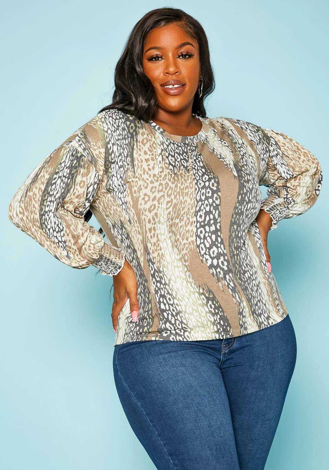 Plus size women’s leopard print top in round neck style, open back design, long sleeves and smocked wrist cuffs.