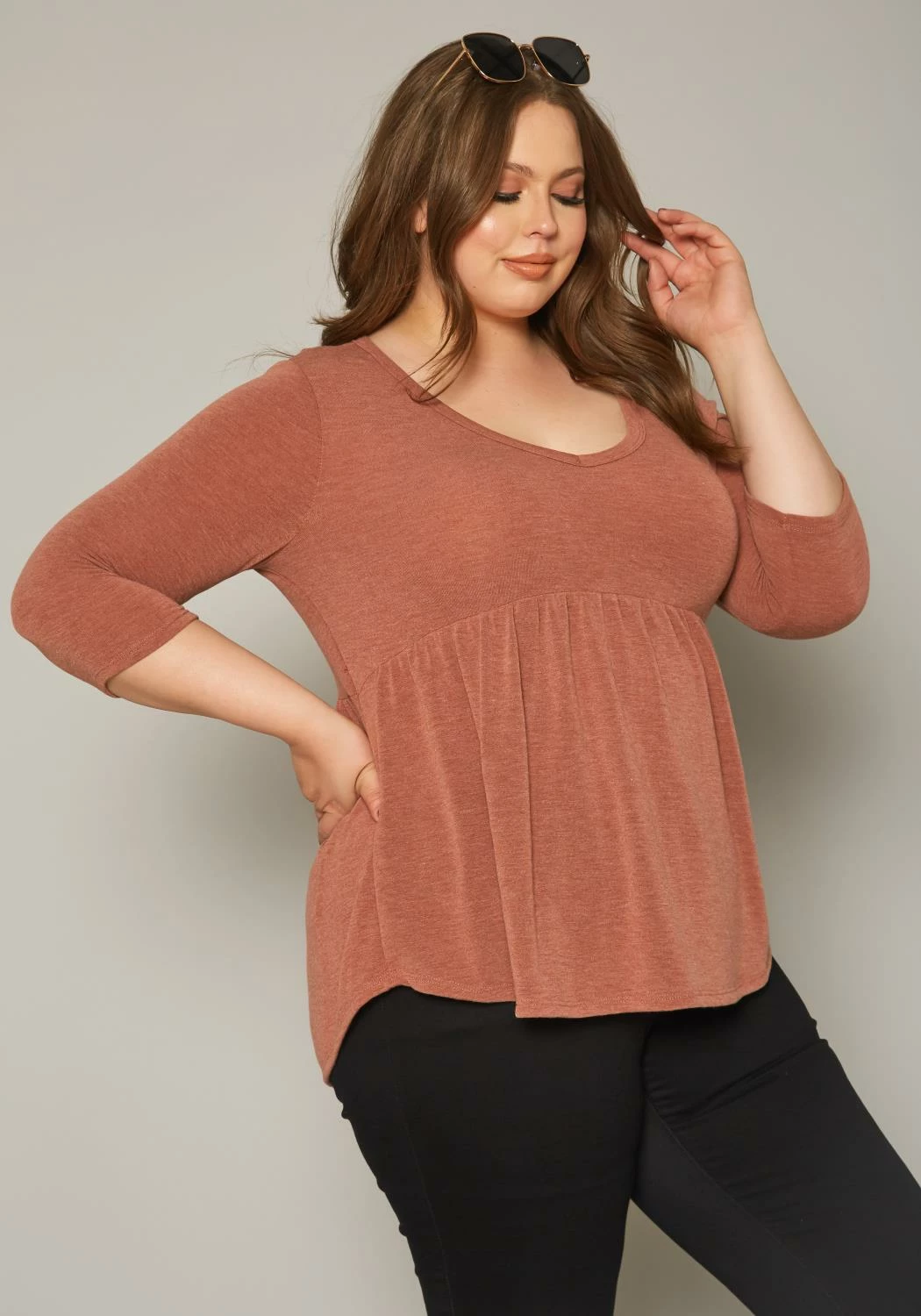 Casual plus size women’s shirt in round neck style, flare design and 3/4 long sleeves.