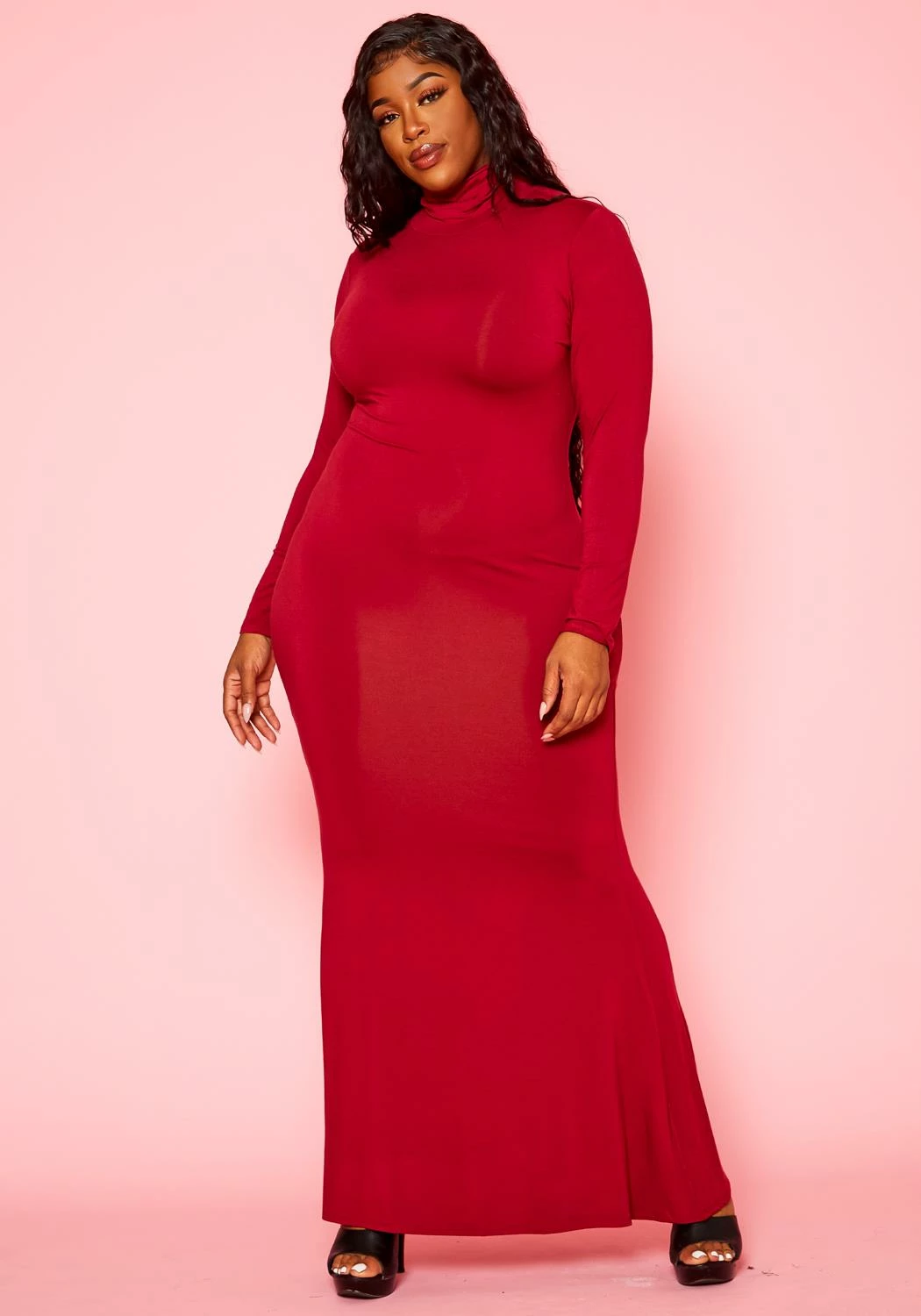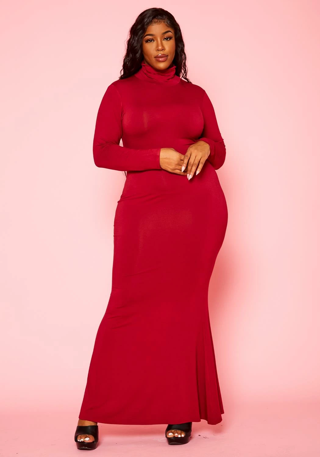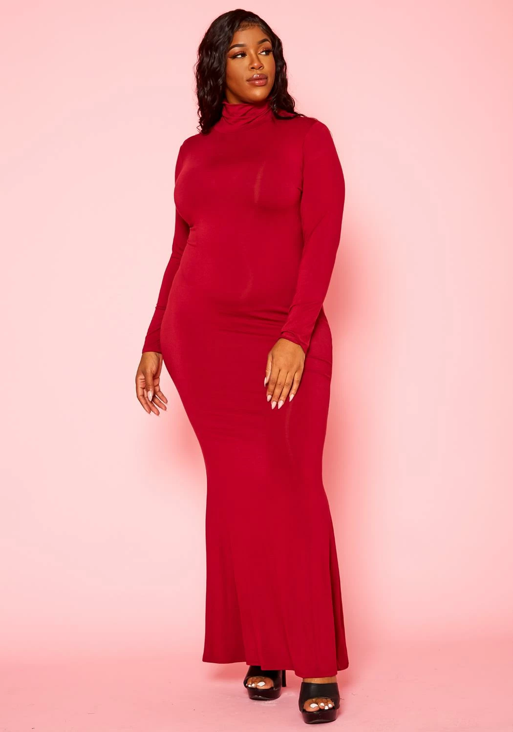 Simply effortless plus size women’s maxi dress with mermaid flare hem, fitted long sleeves and mock neck style.
