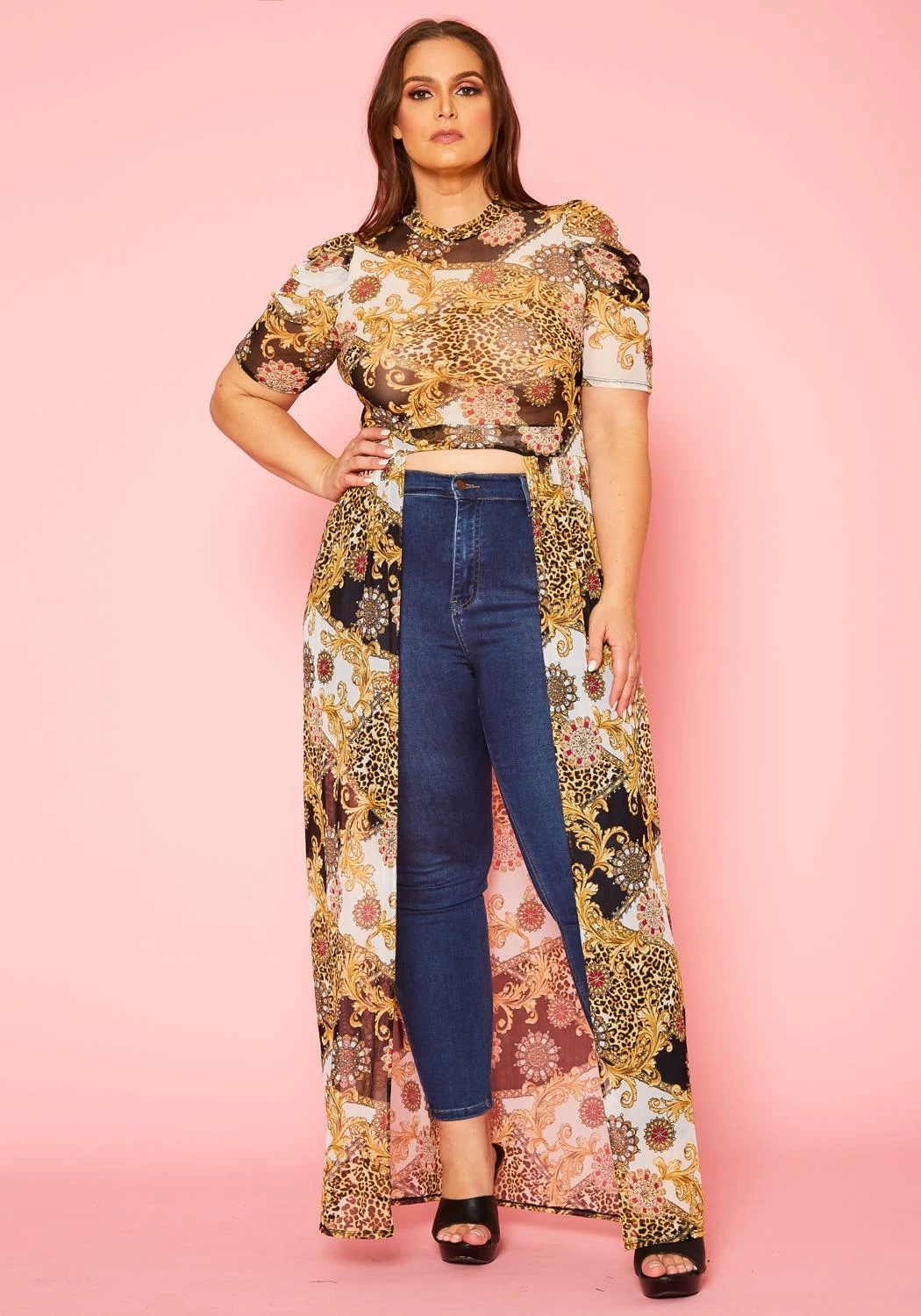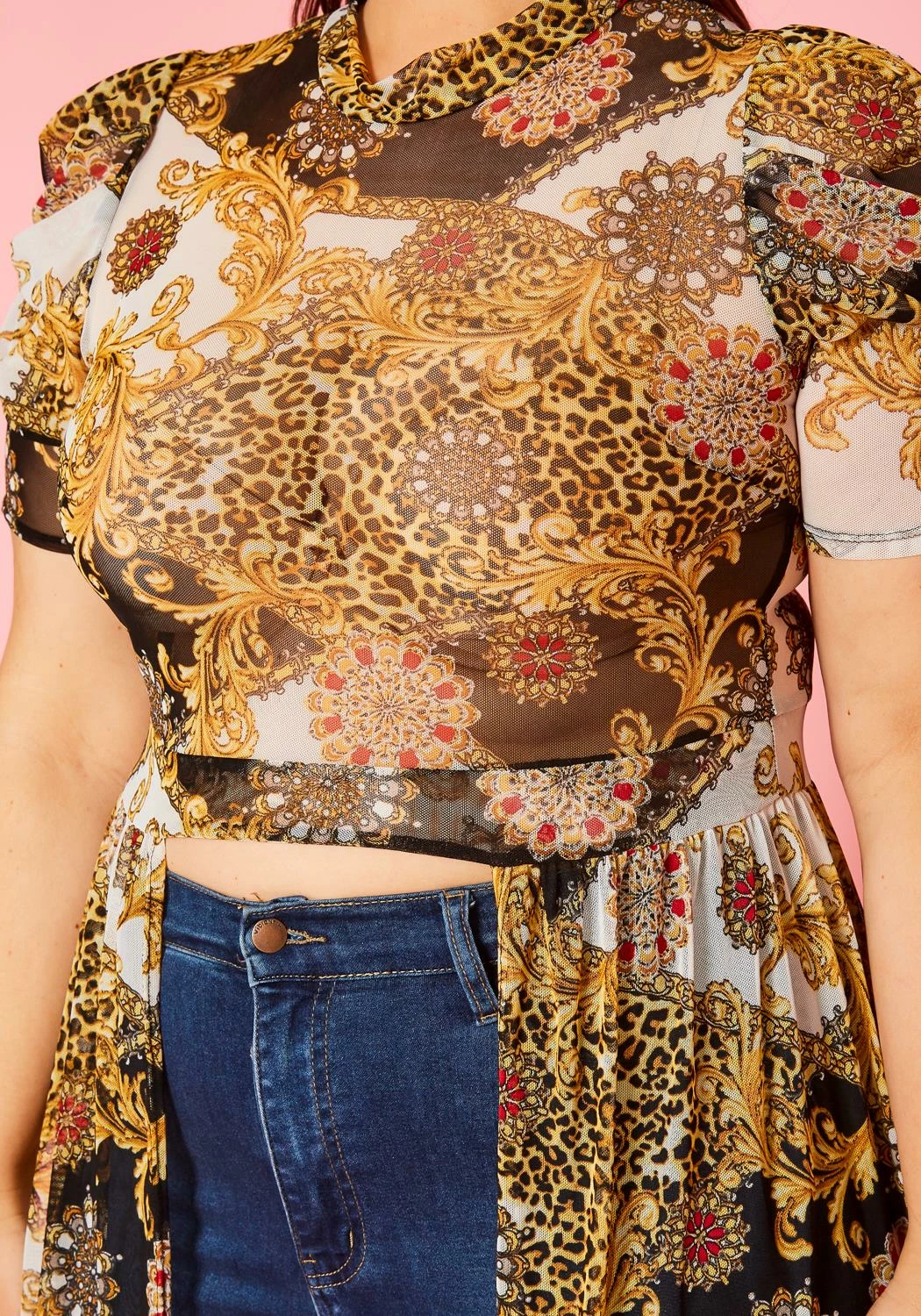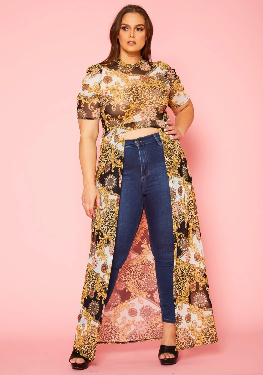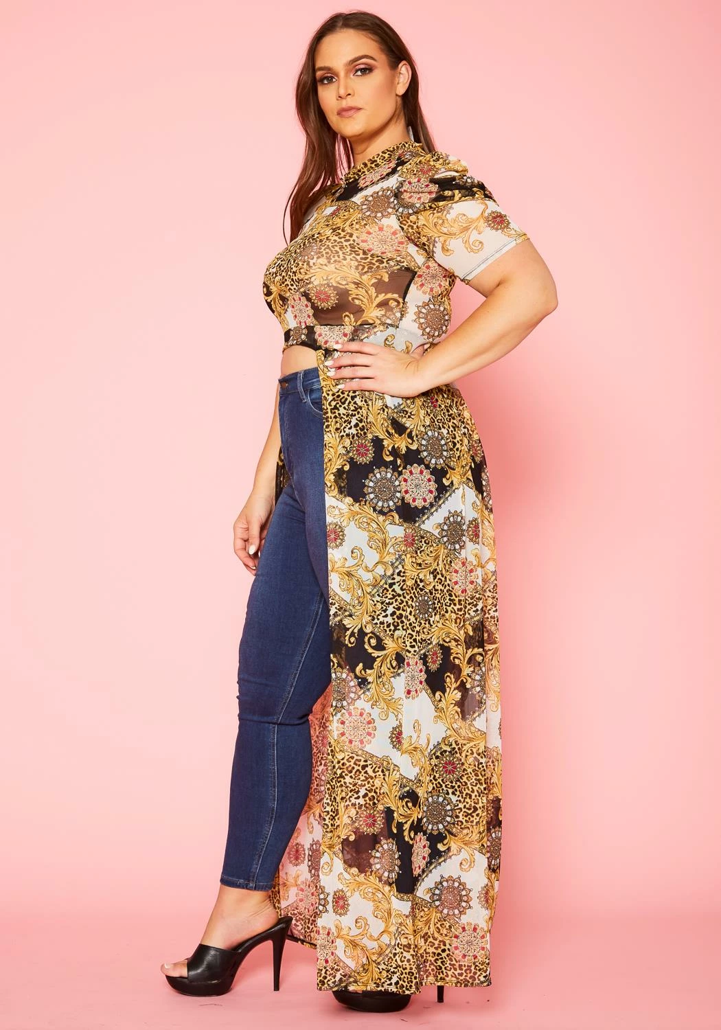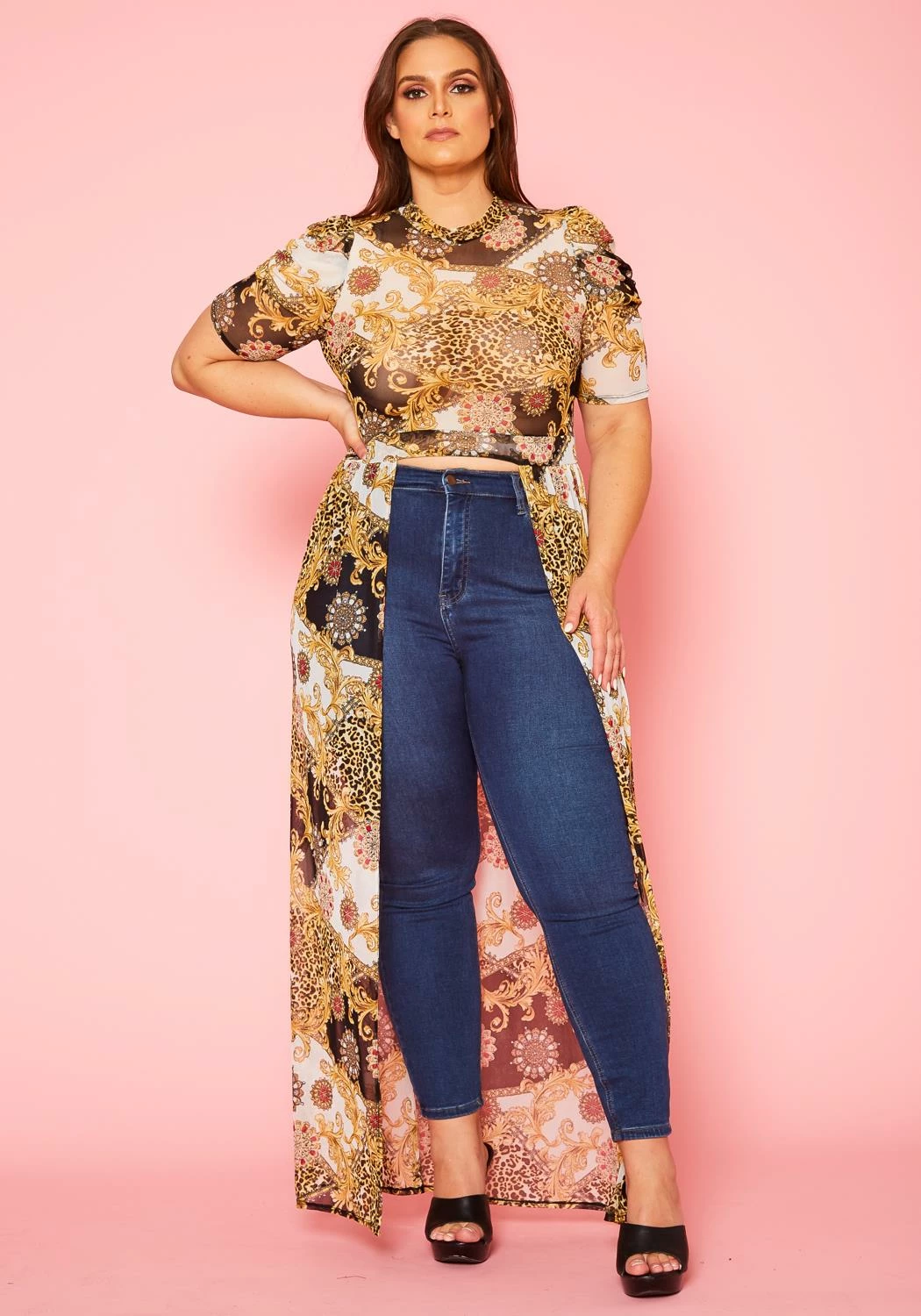 Stylish plus size women’s top in multi print, high to low design, chiffon flare, high neck style and short sleeves. Contains back zipper closure.