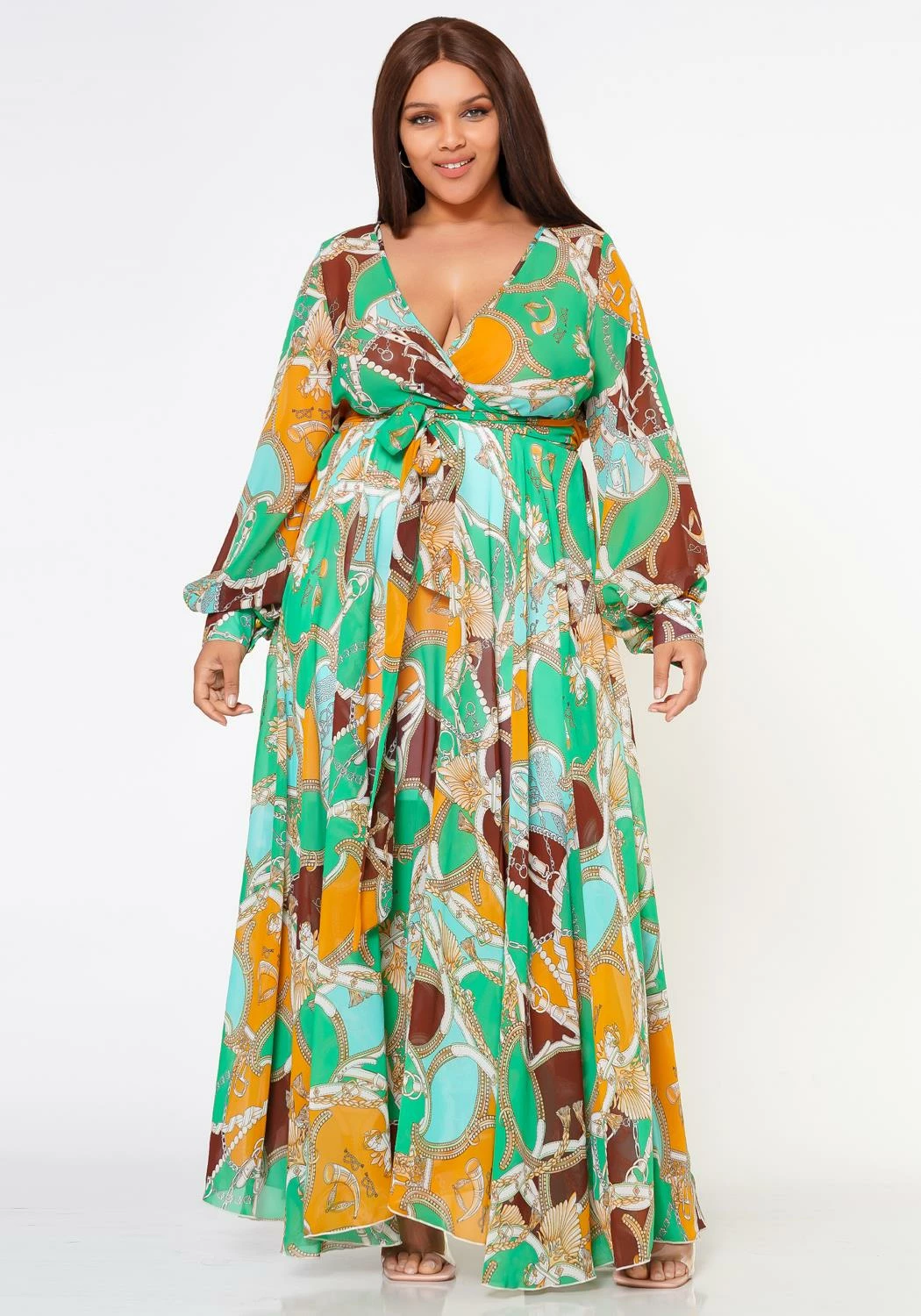 Absolute gorgeous plus size women’s maxi dress in multi pattern, v-neck style, long sleeves, fitted wrist cuffs and waist tie ascent.