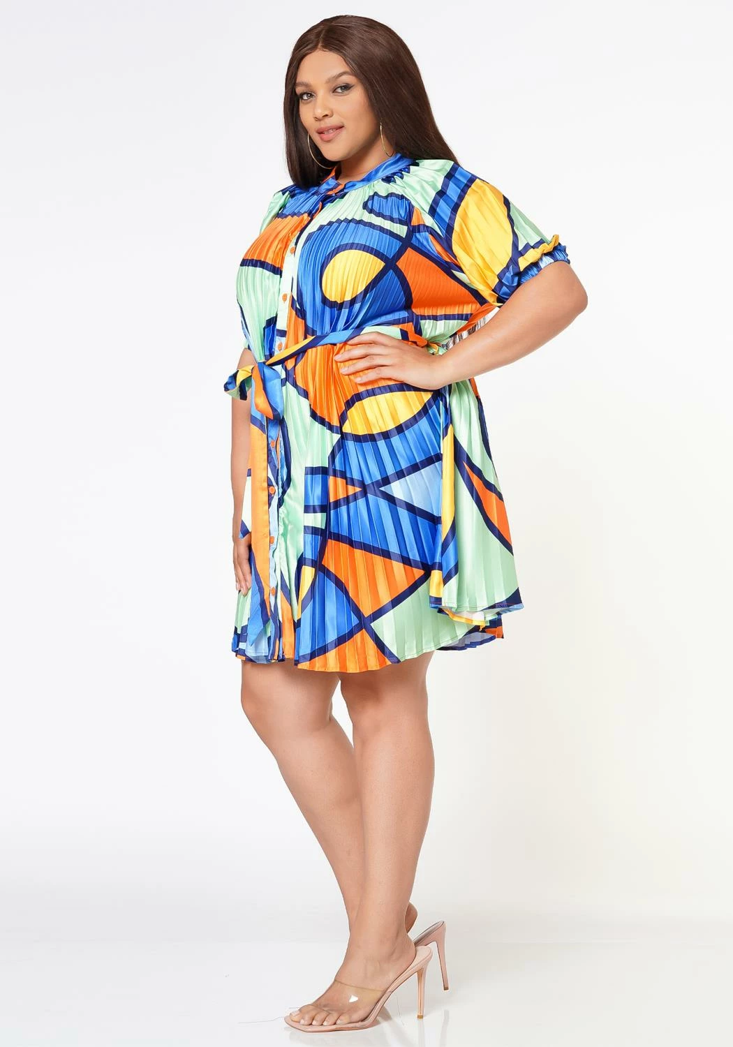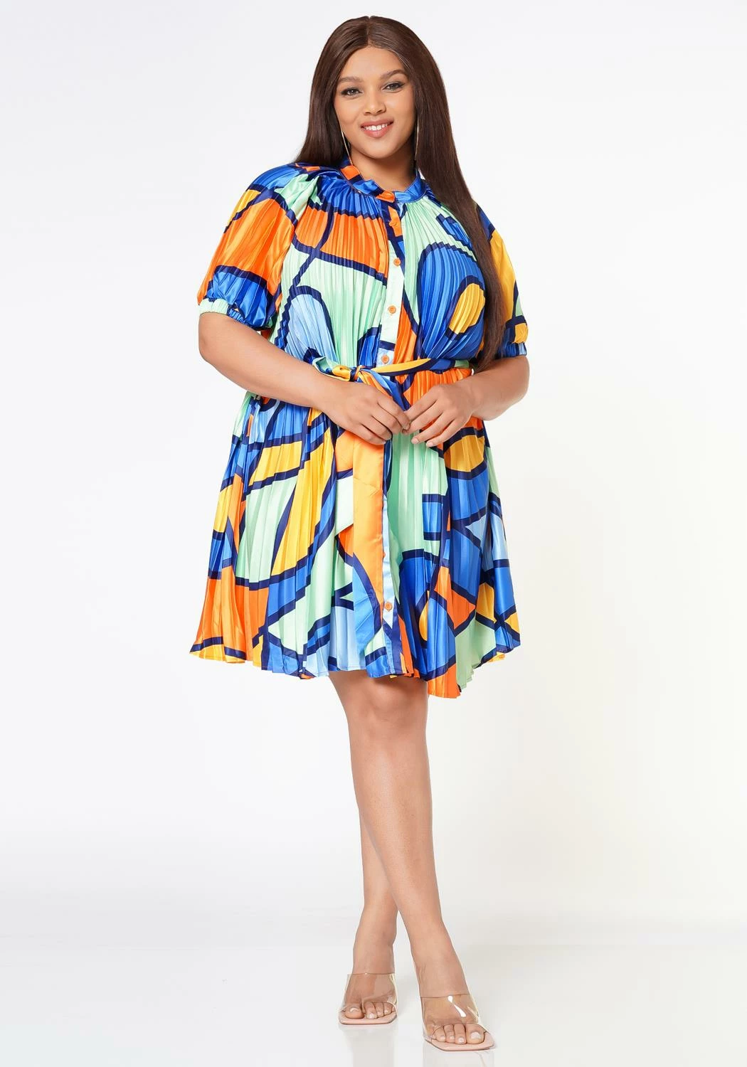 Gorgeous multi pattern fit to flare mini dress with flattering pleated design, puff short sleeves, high neck and waist tie ascent.