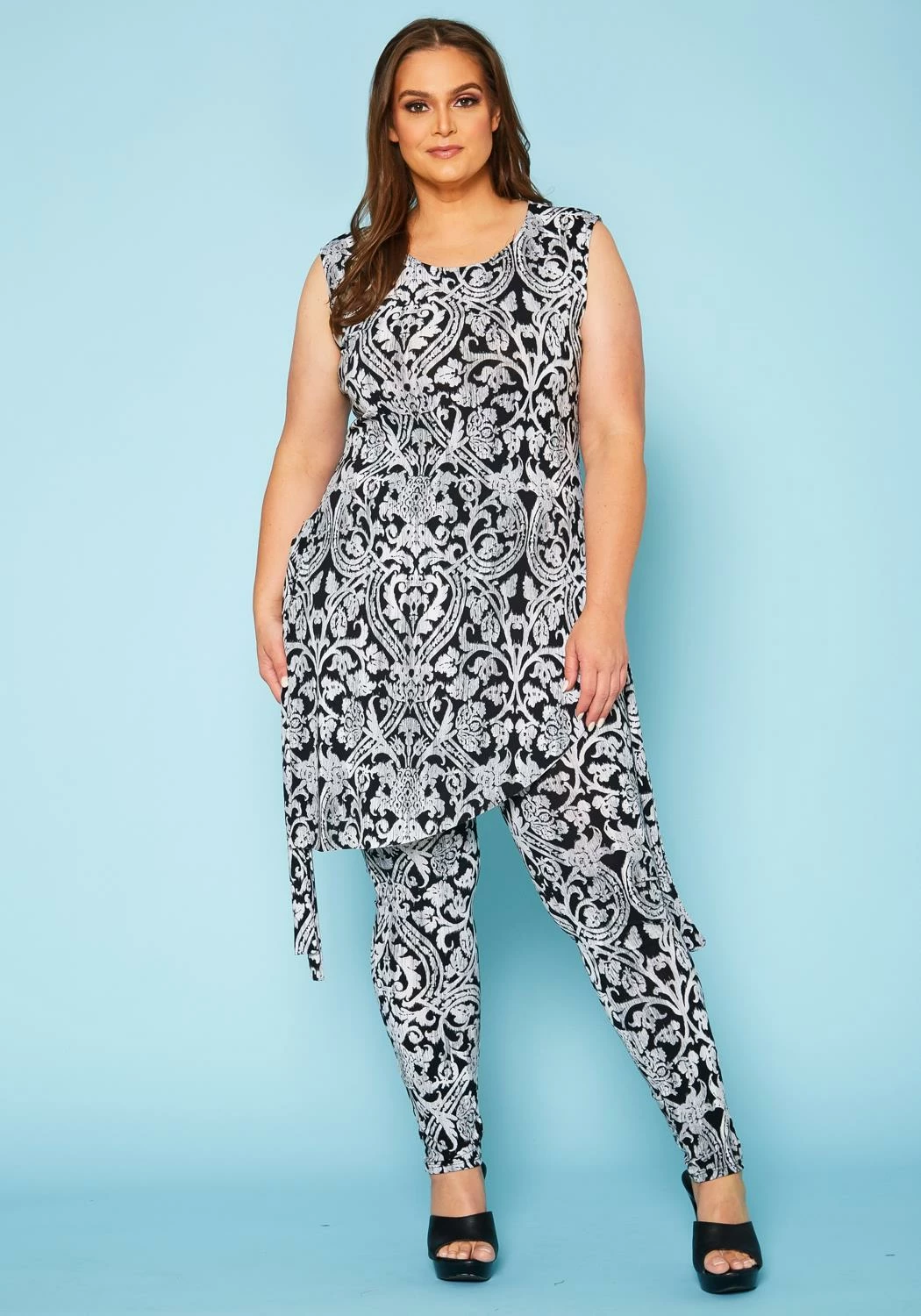 Plus size women’s set, featuring a asymmetrical top, sleeveless, round neck hem with side tie up detail paired with high waist leggings.