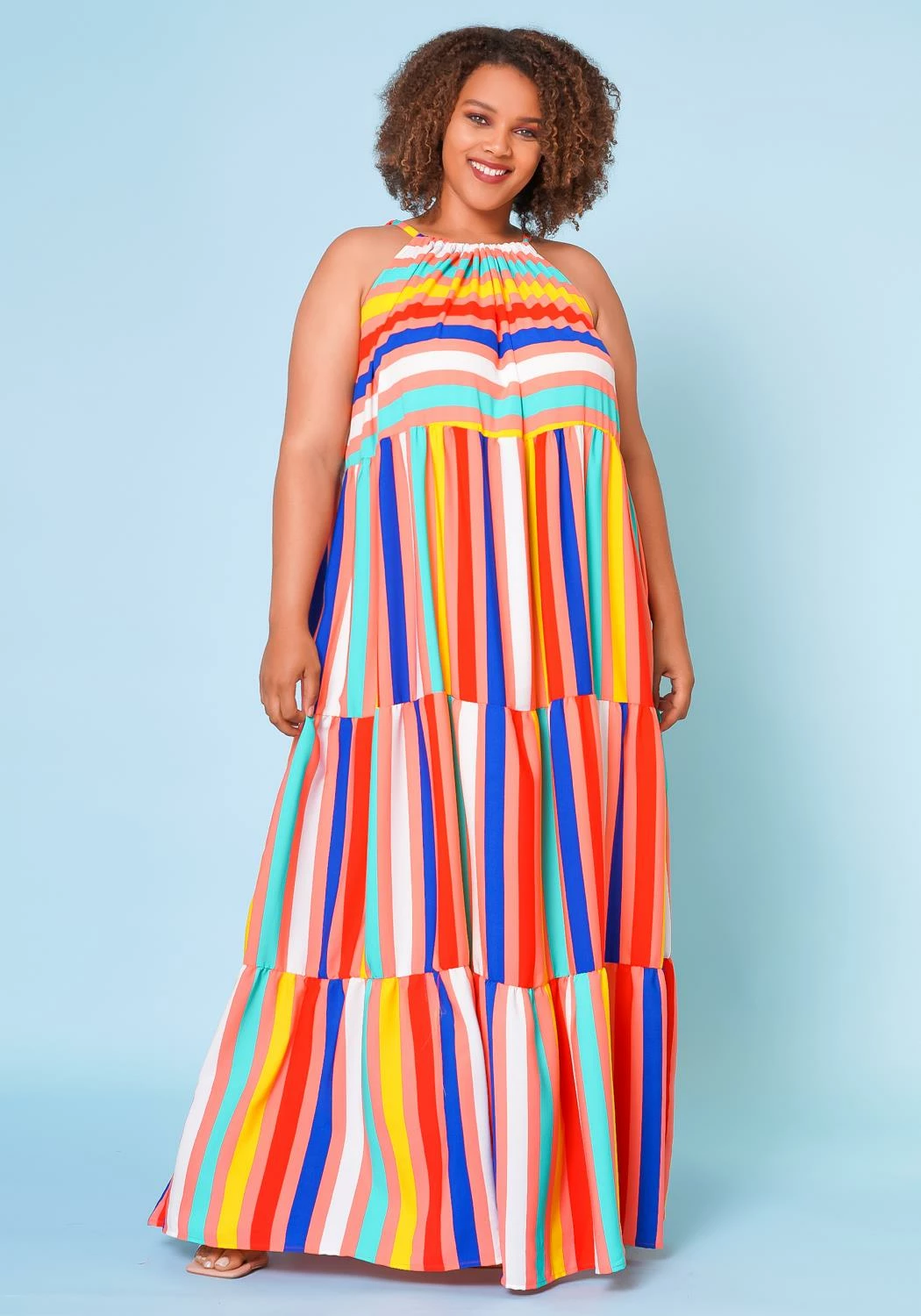 Multi striped plus size women’s maxi dress in wide flare design, tiered stitch hem, halter neck tie closure, sleeveless design and lightweight material.