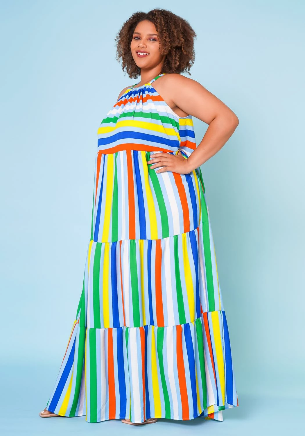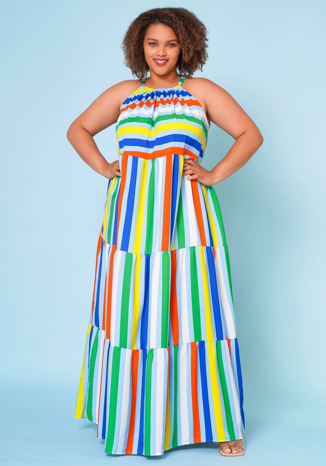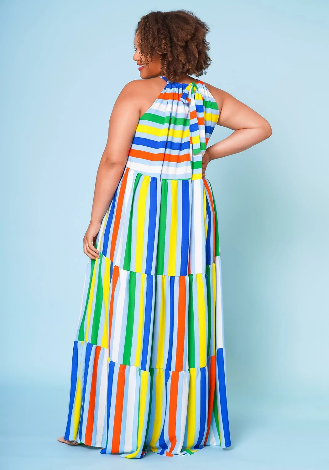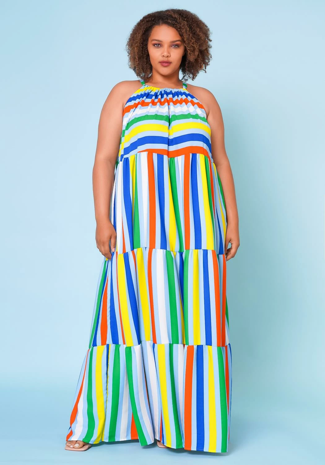 Multi striped plus size women’s maxi dress in wide flare design, tiered stitch hem, halter neck tie closure, sleeveless design and lightweight material.