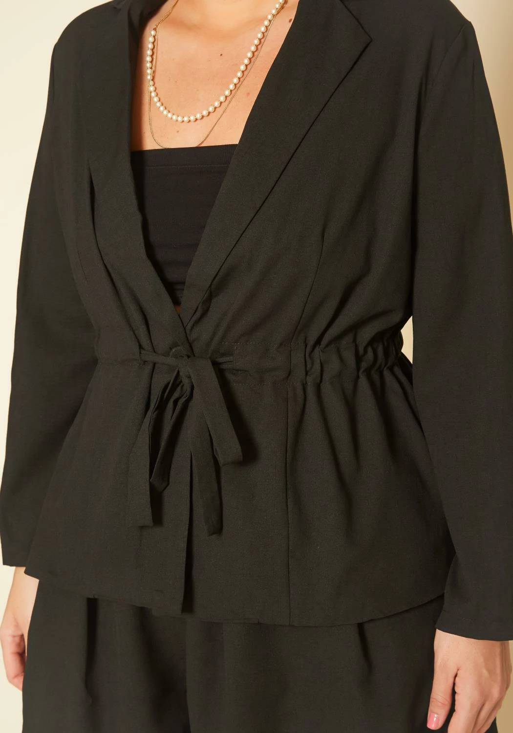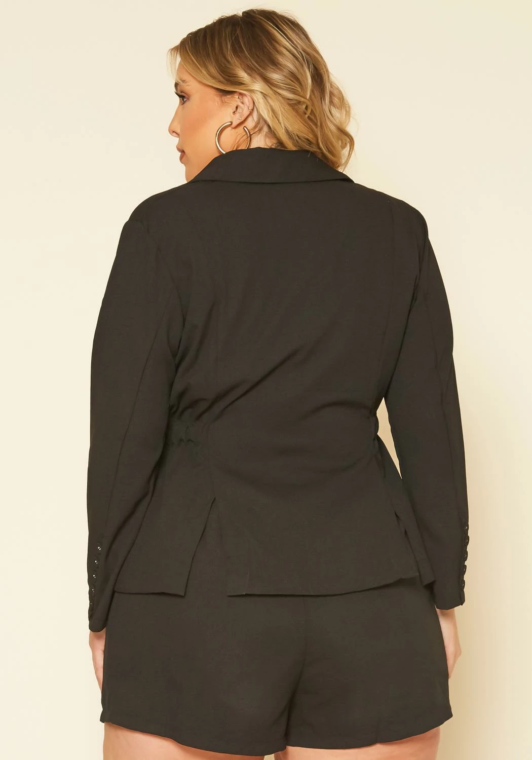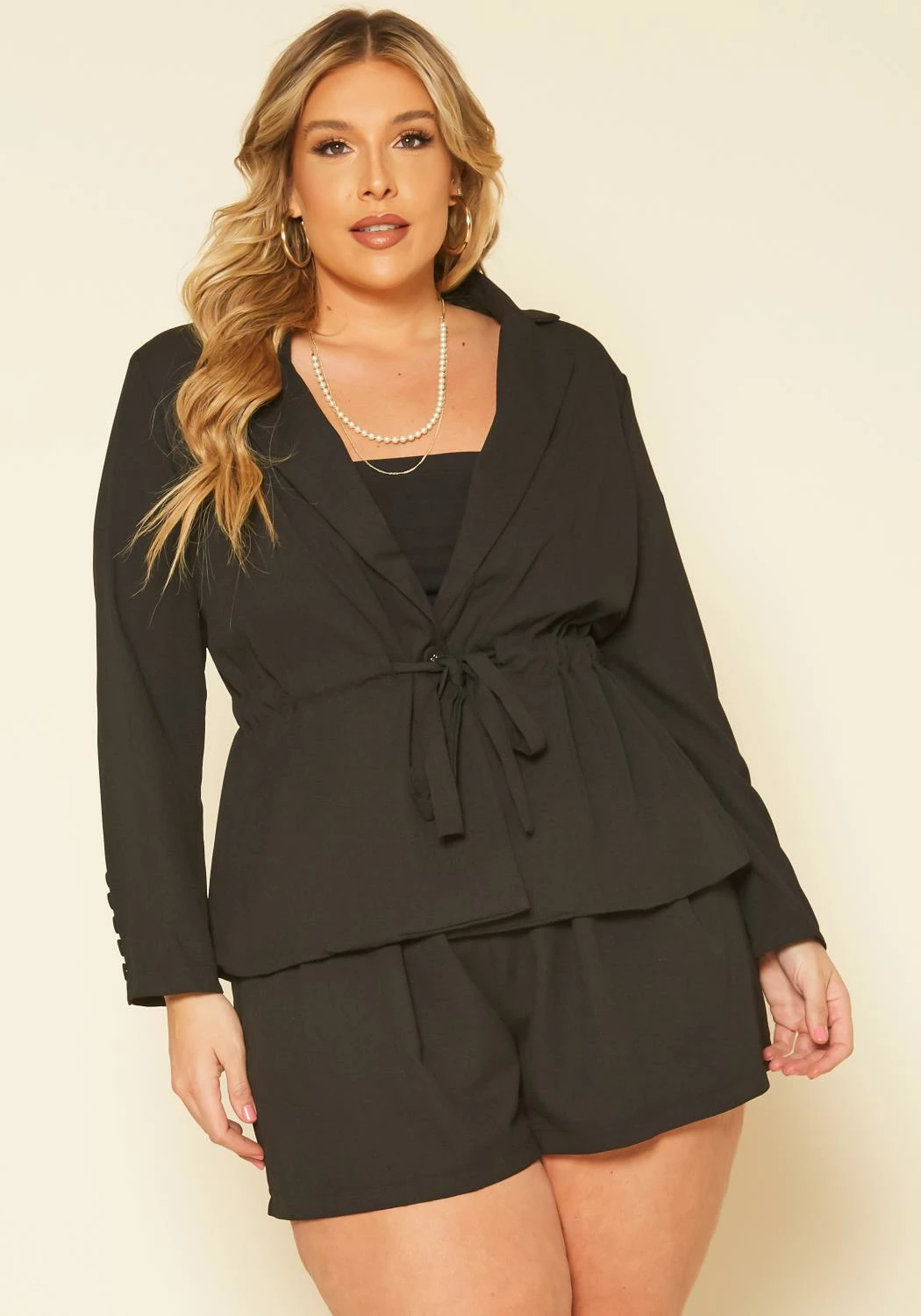 Business casual plus size women’s matching set which features a tie front notch collar blazer and high waist shorts.