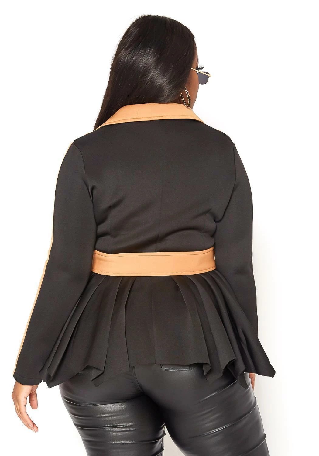 Sophisticated peplum top in notch collar style, front button hem, belted waistline and back color contrast design.