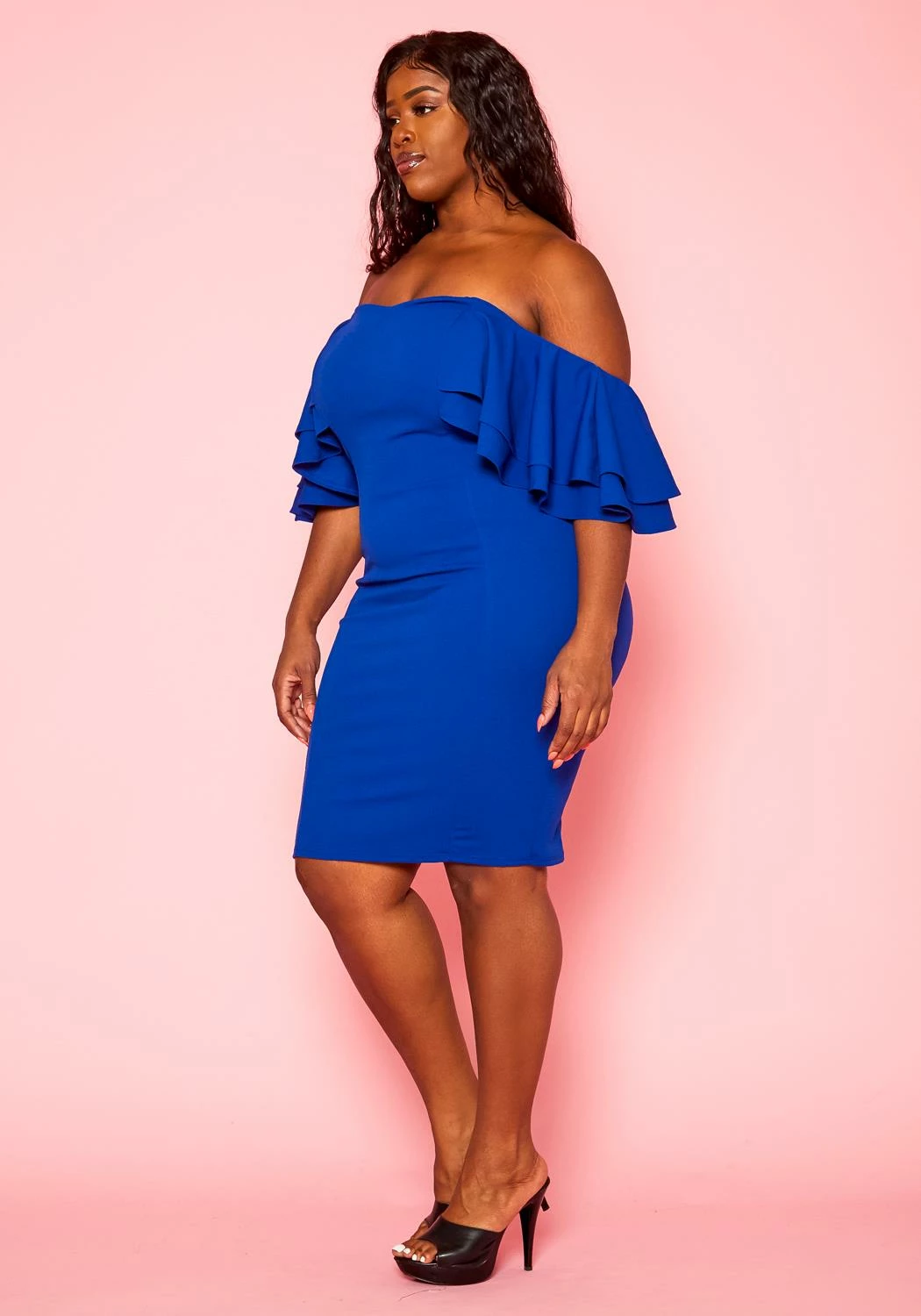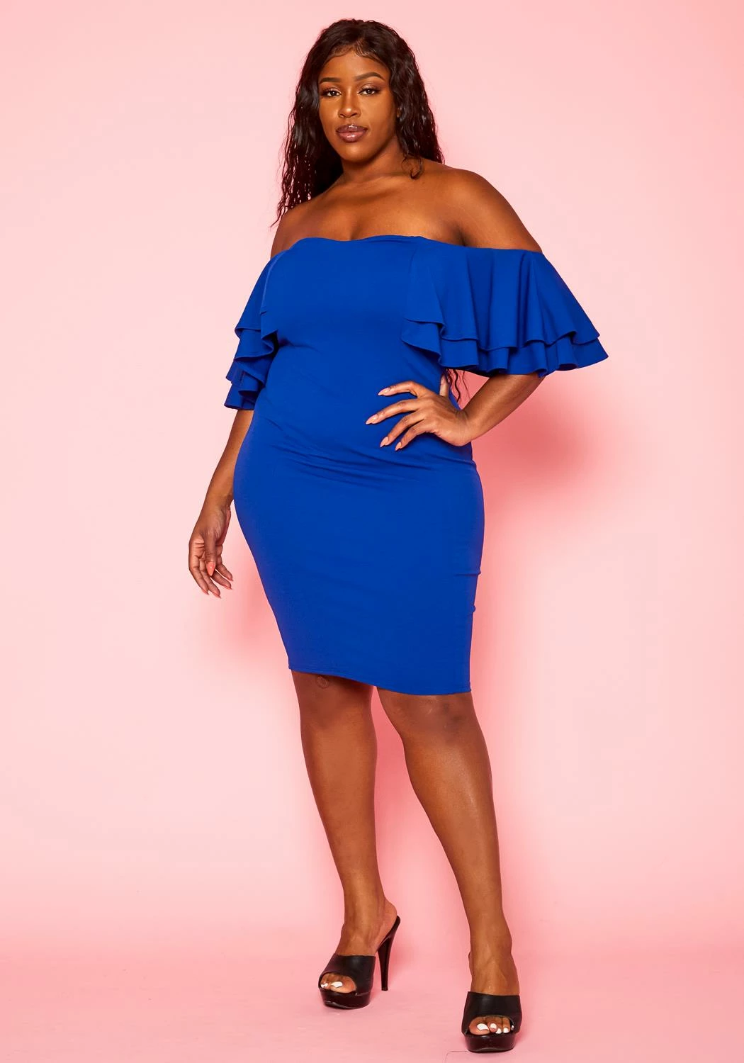 Gorgeous plus size women’s mini dress in off shoulder style and ruffle hem short sleeves.