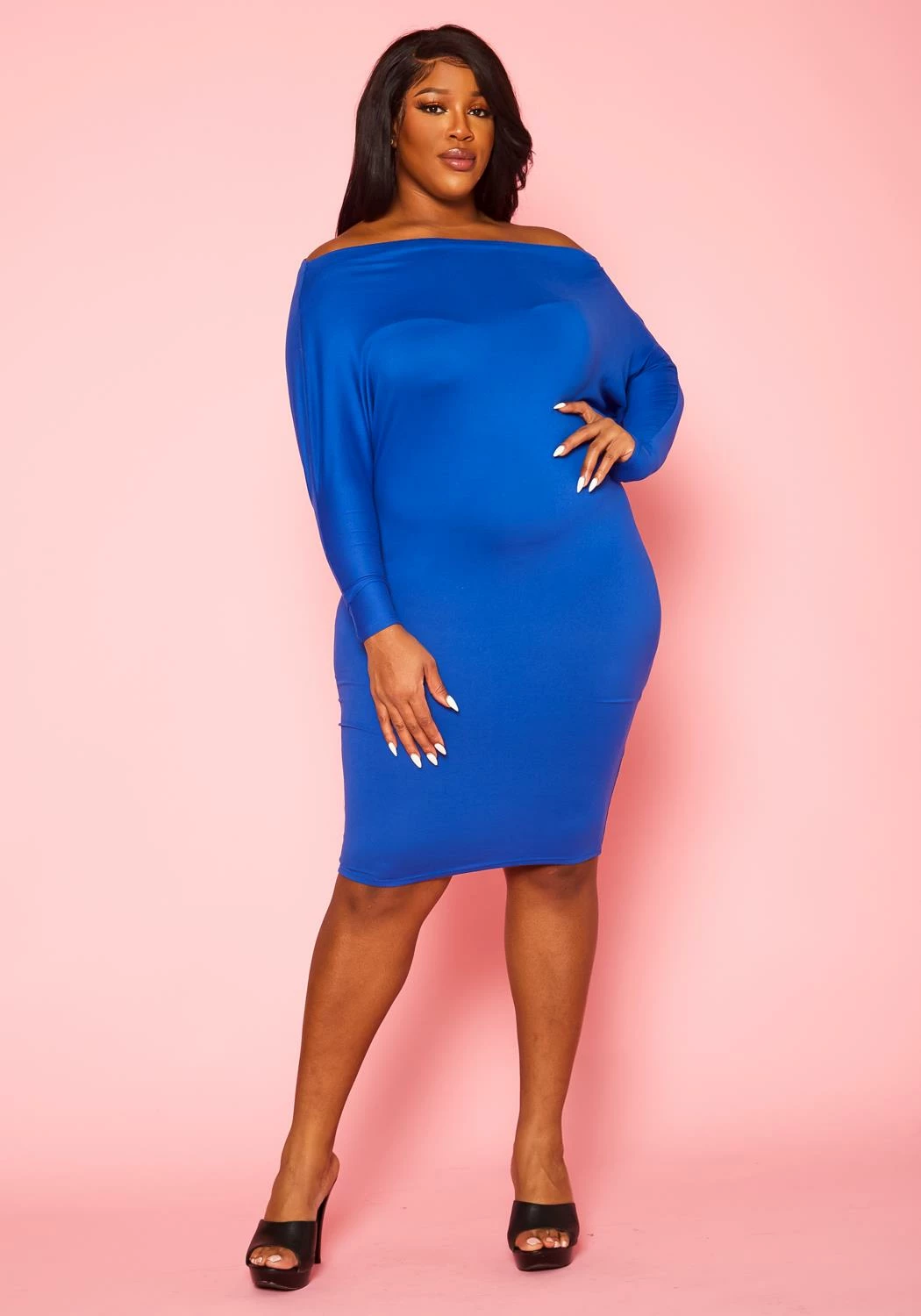 Effortless plus size women’s solid color mini dress in lovable slinky material, off shoulder design, dolman long sleeves and bodycon fit.