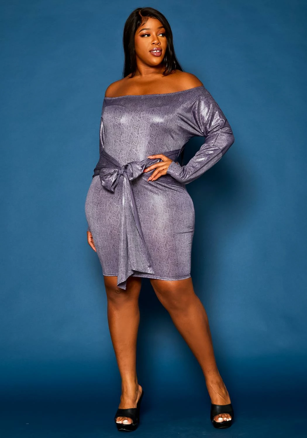 Girls night out bodycon mini dress in off shoulder style, snack pattern, dolman long sleeves and waist tie hem.