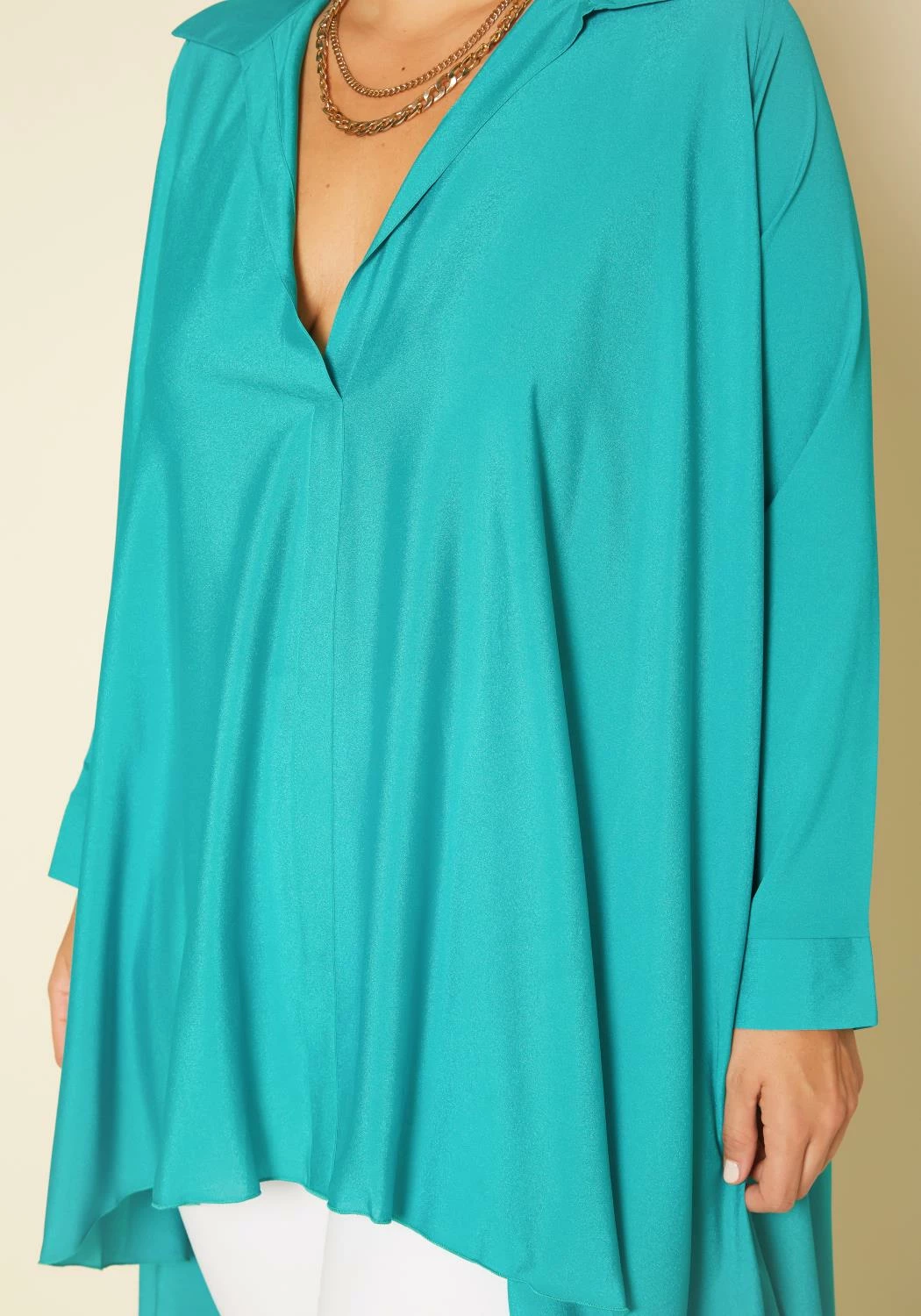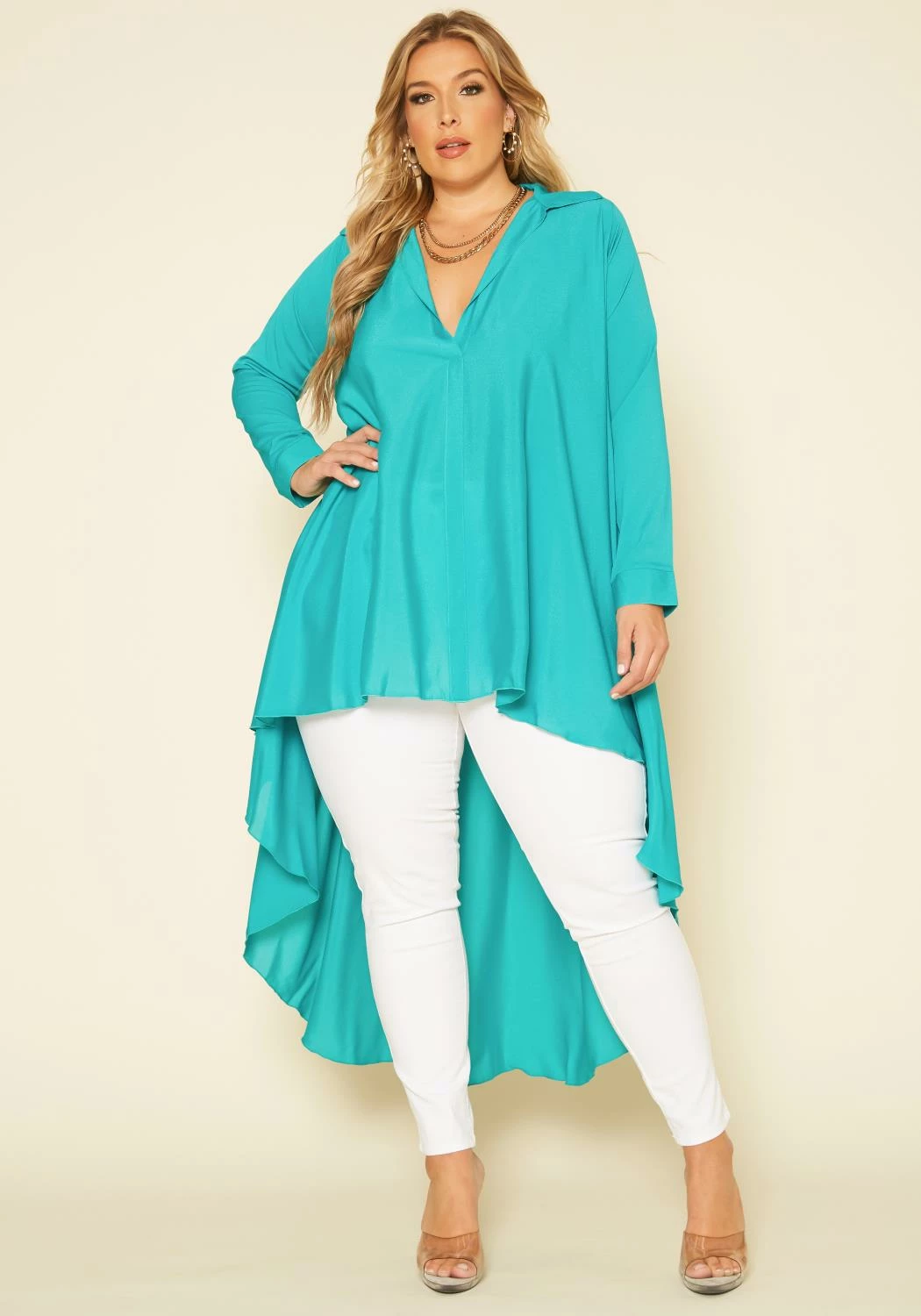 Make a fabulous impression in this plus size women’s chiffon blouse! Features high to low style and open collar ascent. *Material is sheer.