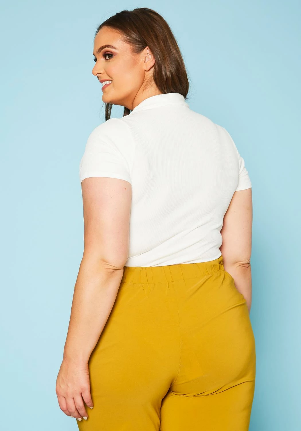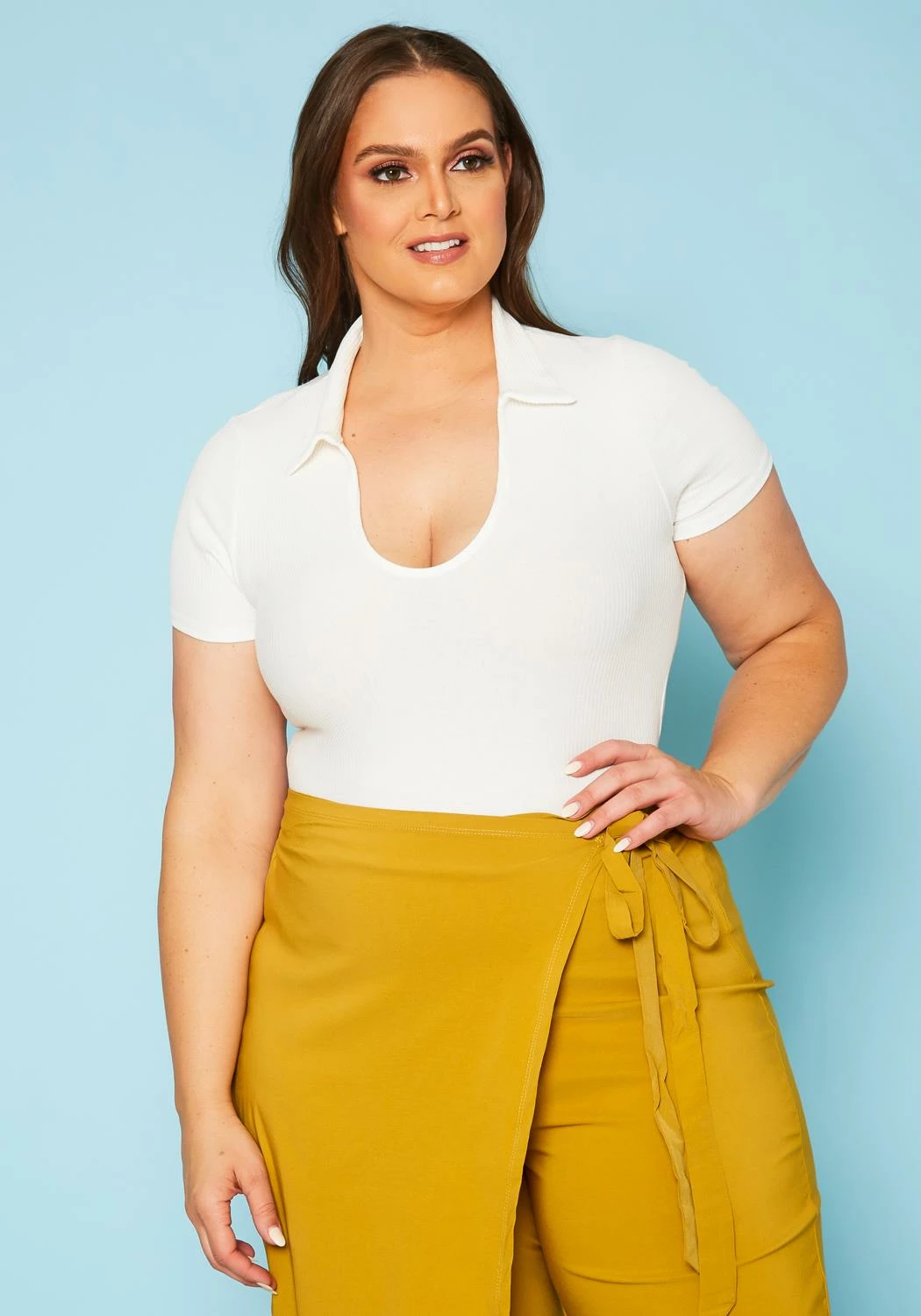 Casual plus size women’s ribbed bodysuit in open collar style, short sleeves and slim fitting design.