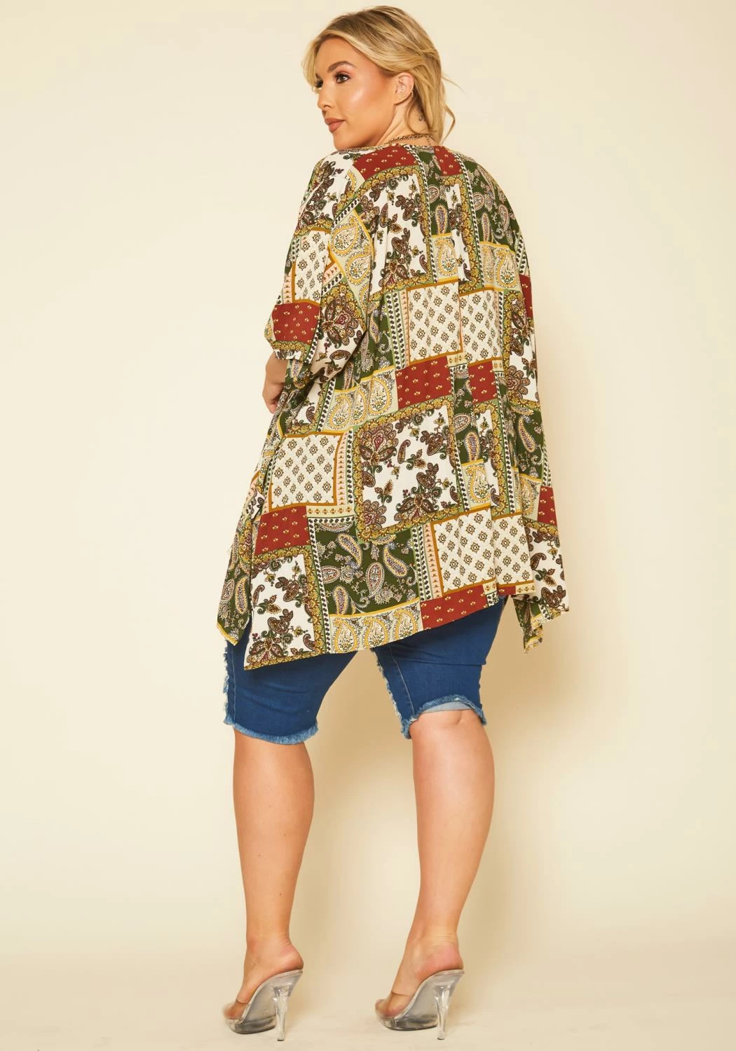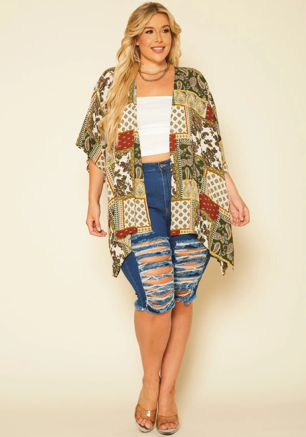 Fresh plus size women’s duster cardigan in paisley pattern, open front design and short sleeves.