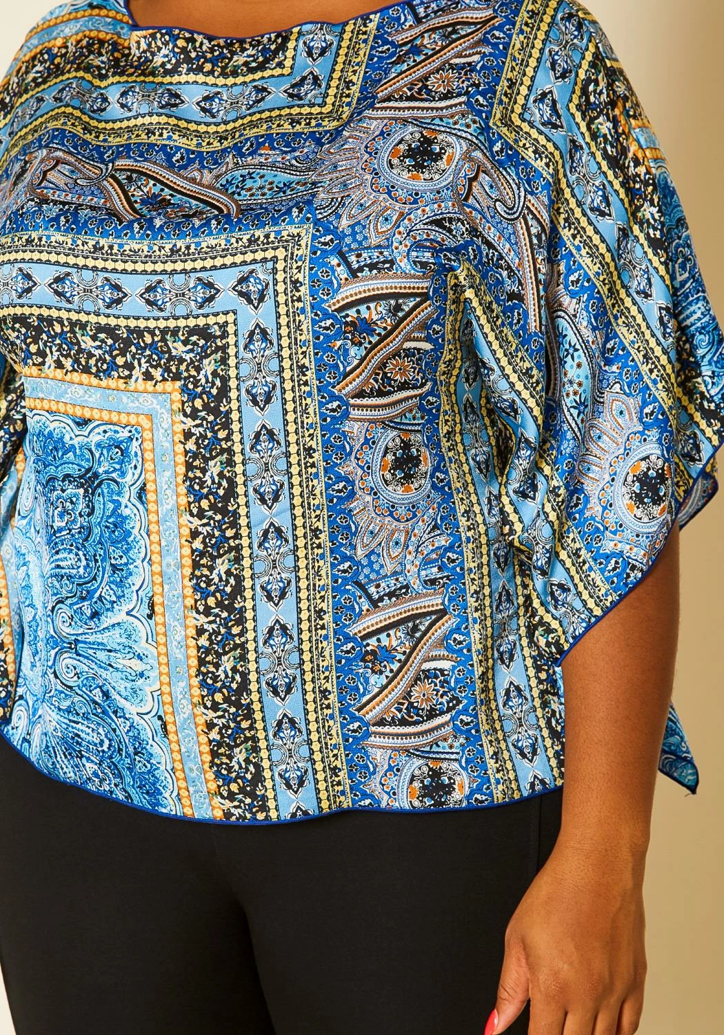 Plus size women’s paisley pattern top in dolman short sleeves and relaxed fitting.