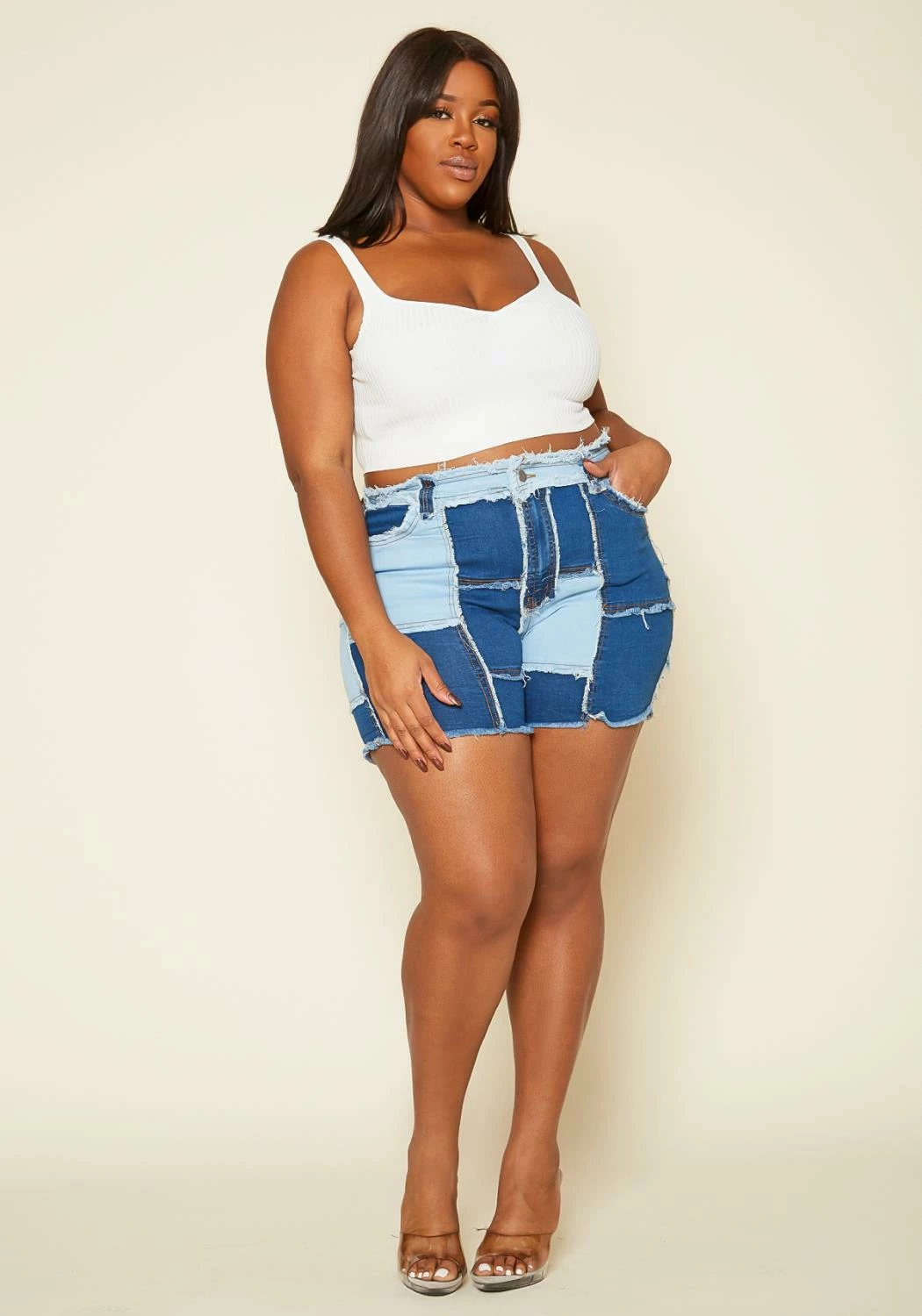 Trendy denim shorts for plus size women in patchwork denim design, high waist style, fray distressed details and pocket hem.