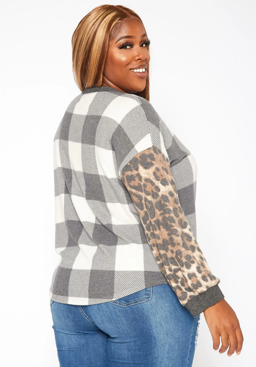 Casual plus size women’s shirt in plaid-leopard pattern splice design, v-neck style, button detail, twist hem and long sleeves.