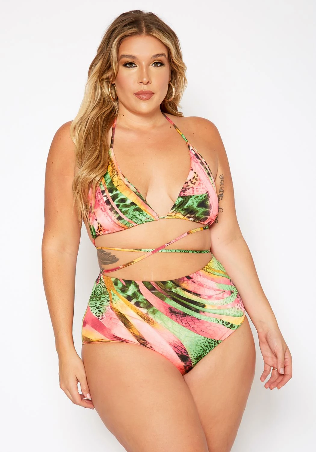 Enjoy the shore in this colorful swimsuit set which features a halter bikini top, high waist bikini bottom and twist hem, cut out cover up skirt.