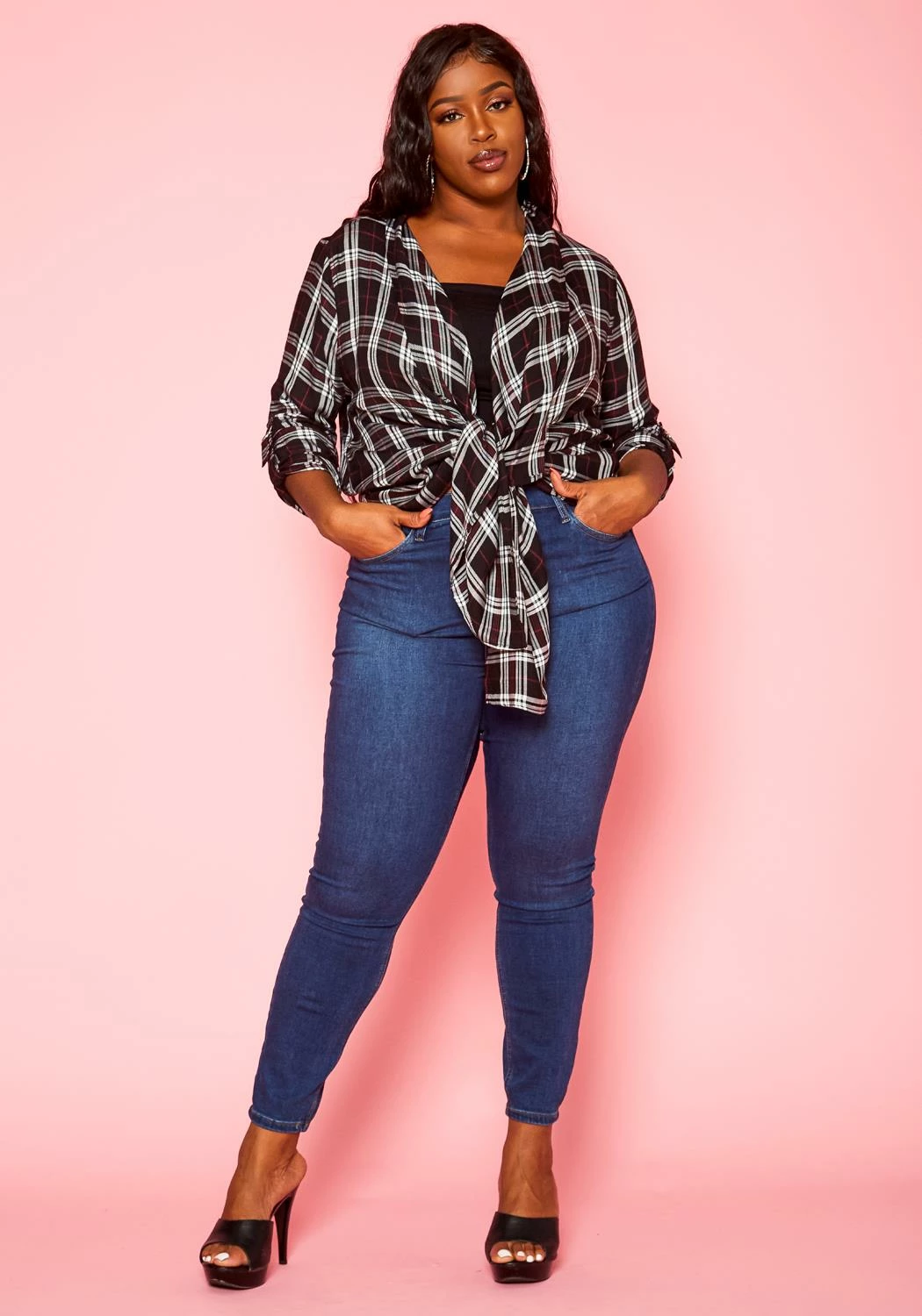 Casual plus size women’s plaid pattern cardigan with waterfall drape front design, open front style, 3/4 long sleeves and lightweight material.