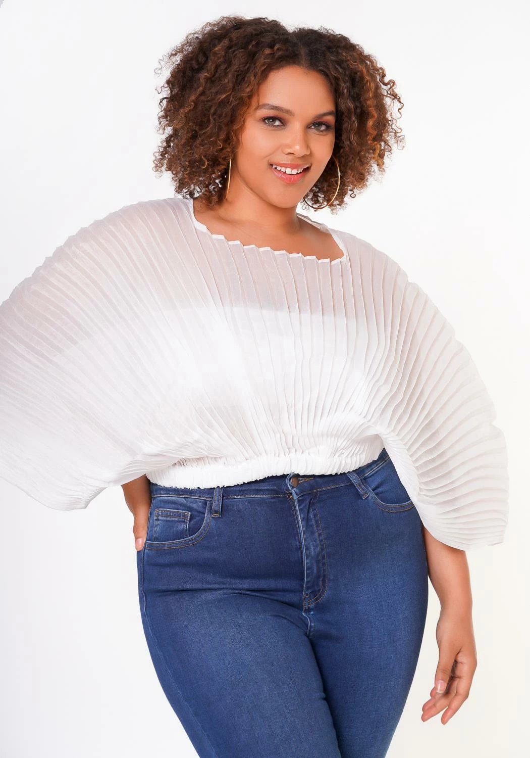 Stylish plus size woman’s dolman top with a round neckline 3/4 sleeves and ruched detail.