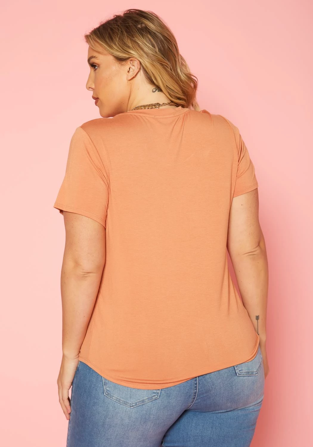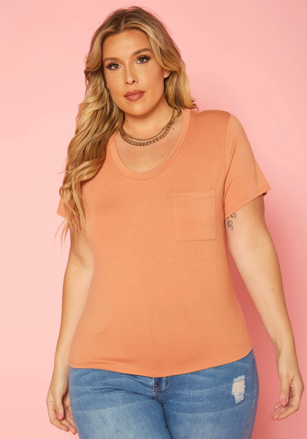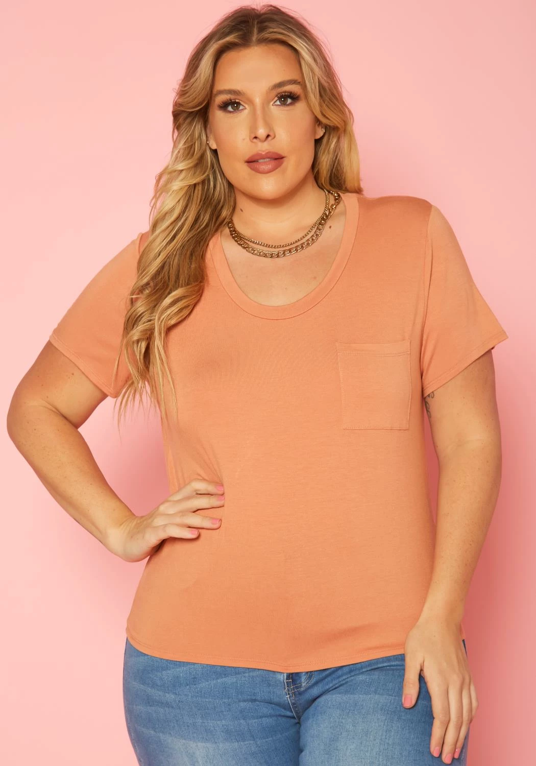Plus size women’s casual t-shirt in round neck style, pocket hem and short sleeves.