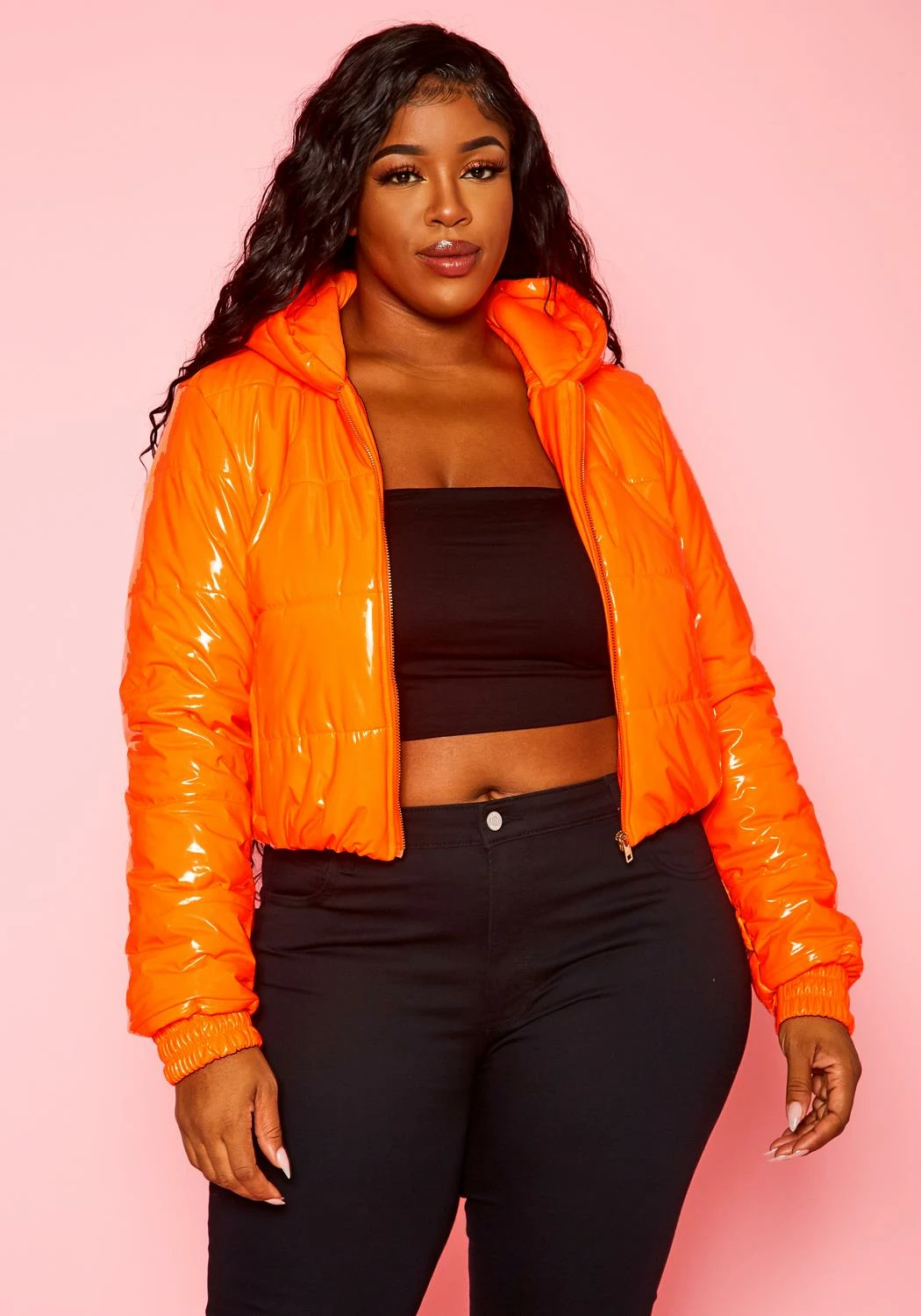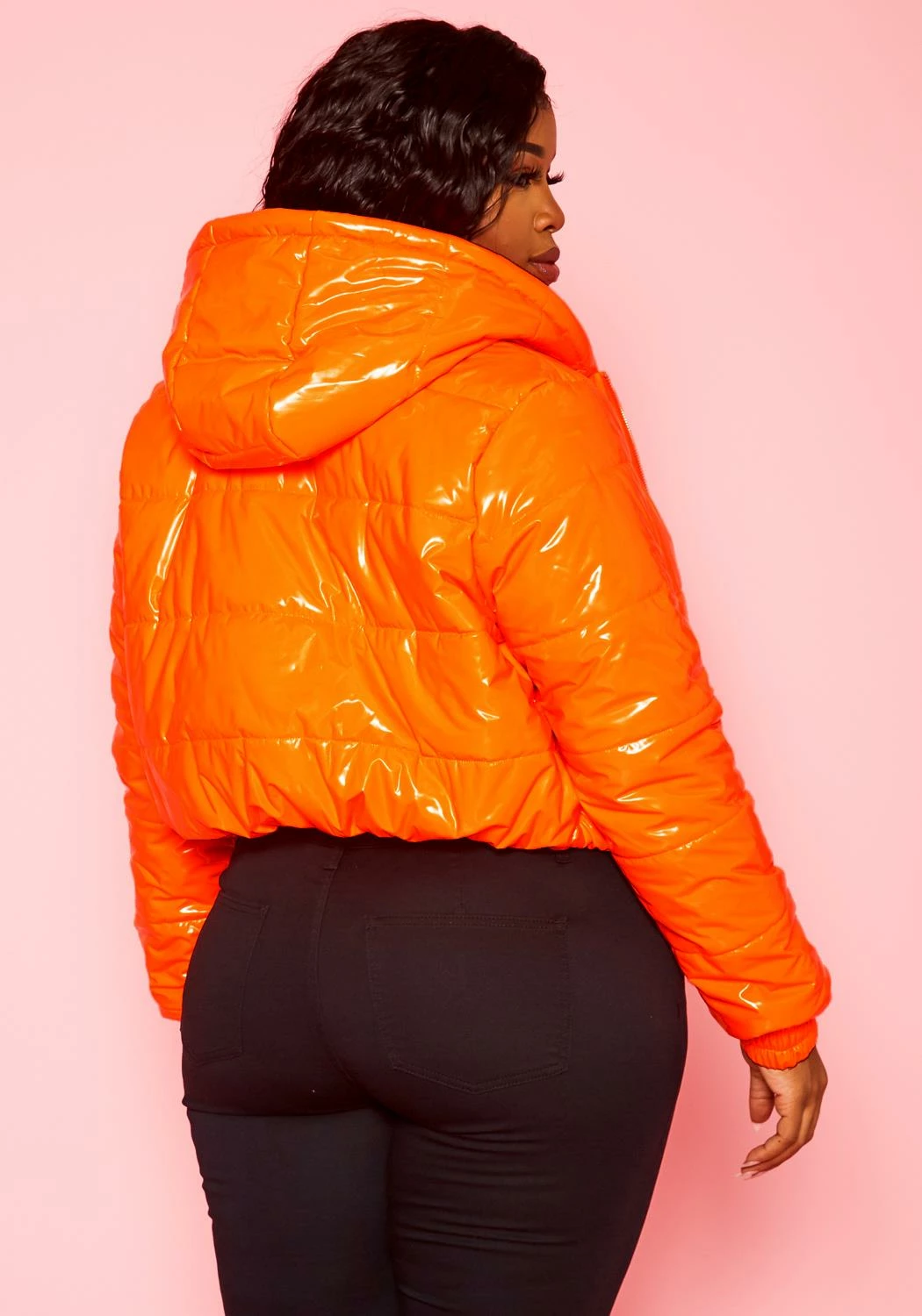 Trending plus size women’s puffer coat in PU faux leather, quilted hem, zipper front, cuffed wrists and hooded design.