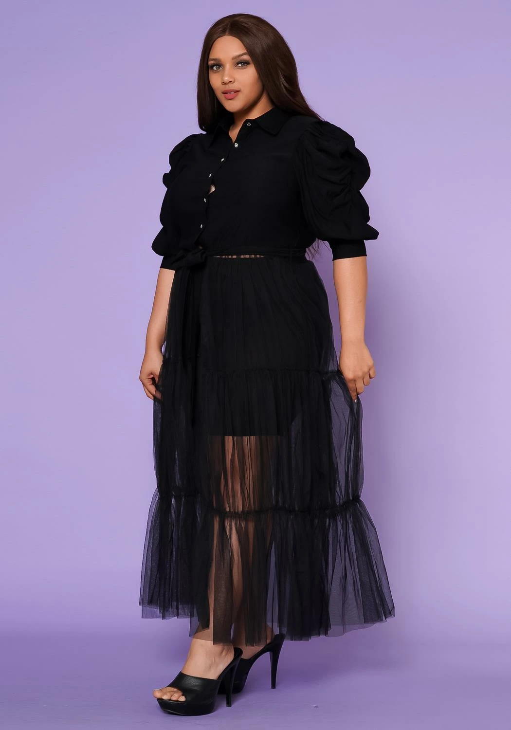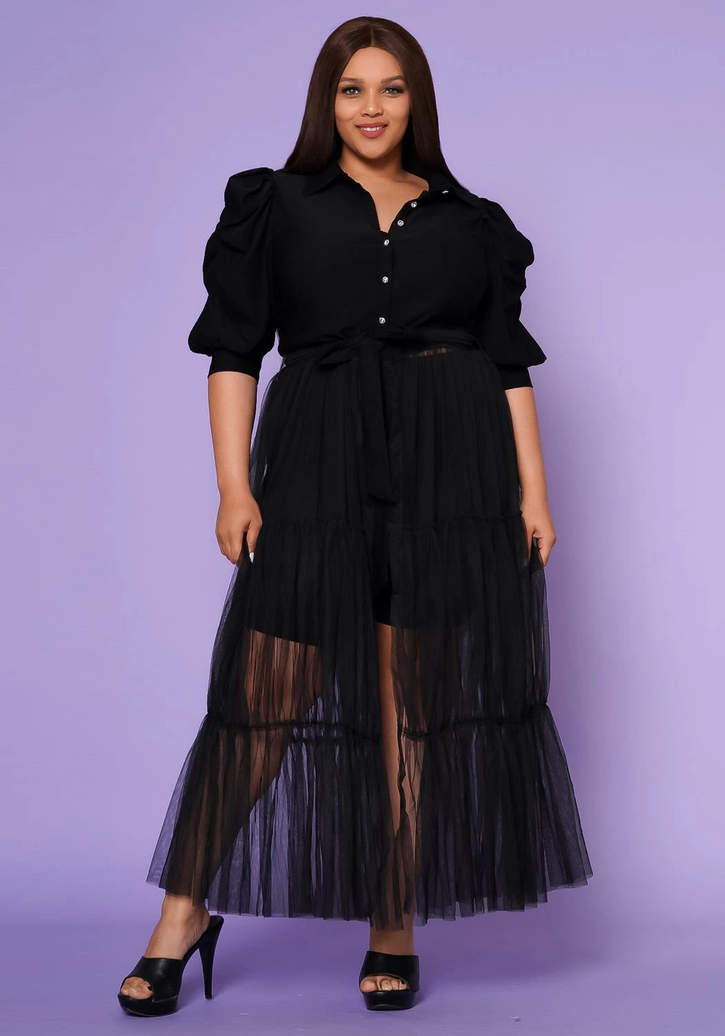 Elegant long tulle blouse made with sheer fabric at the bottom and opaque fabric at the top portion. Features puff short sleeves, button front closure, waist tie ascent and collar neckline. Pair it up with shorts underneath or skinny leather pants for a sophisticate look!