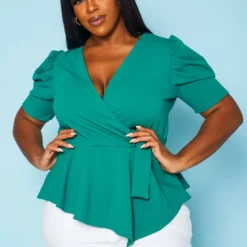 Plus size women’s blouse in peplum style, featuring a surplice hem, short puff sleeves & undetachable D-ring adjustable belt.