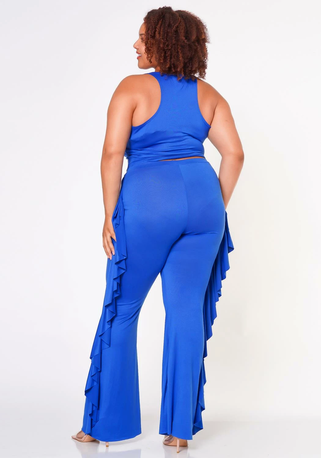 Must have summer matching set which features a racerback fitted top and matching flare leg pants with waterfall ruffle trim design.
