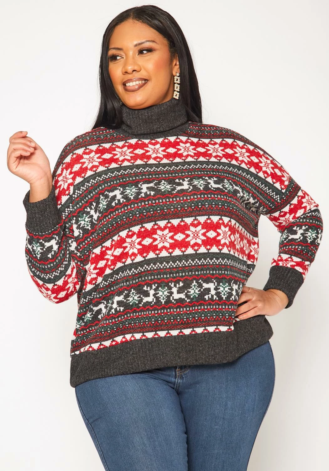 Holiday spirit sweater with reindeer print, turtleneck style, long sleeves and knit material.