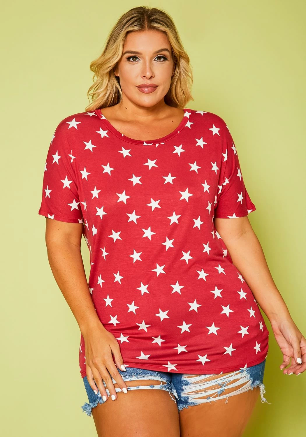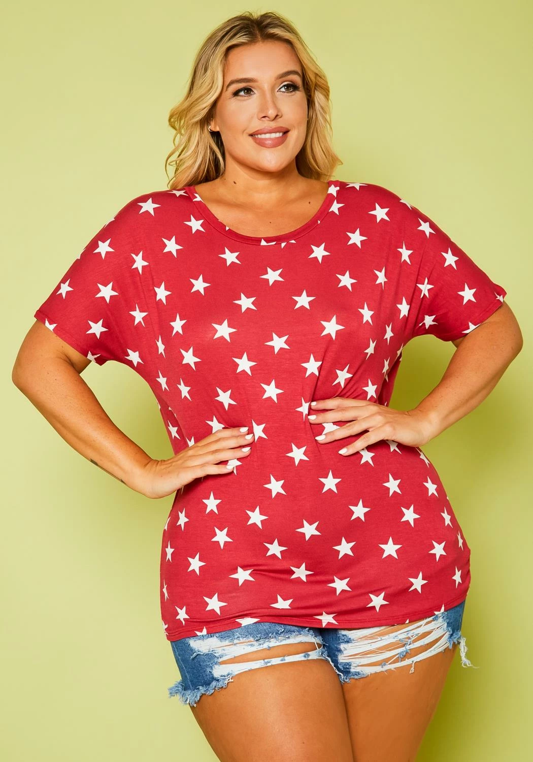Casual plus size women’s t-shirt in star print , round-neck style and short sleeves.